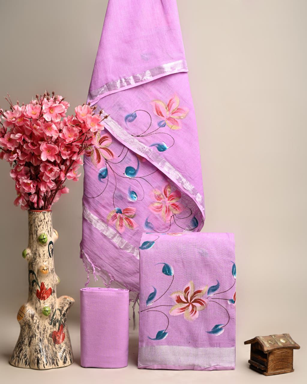 Indulge in the artisanal elegance of Bagru Hand Block Printed Linen Cotton Suit Set. Crafted with care, this set features delicate lavender blossoms on soft linen cotton fabric. The silver border adds a touch of sophistication, making it ideal for special occasions. The top, dupatta, and bottom pieces offer comfort and style, showcasing the essence of traditional Indian craftsmanship.