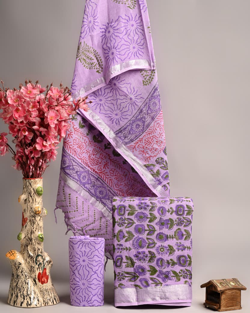 Elevate your ethnic wardrobe with this exquisite hand block printed linen suit set from Blockart. Crafted with care, the top and dupatta feature intricate floral motifs in shades of lavender, green, and red, complemented by a silver border for a touch of elegance. The comfortable cotton bottom completes the set, ensuring a stylish yet relaxed wear experience. Embrace the artistry of Indian block printing with this premium ensemble.