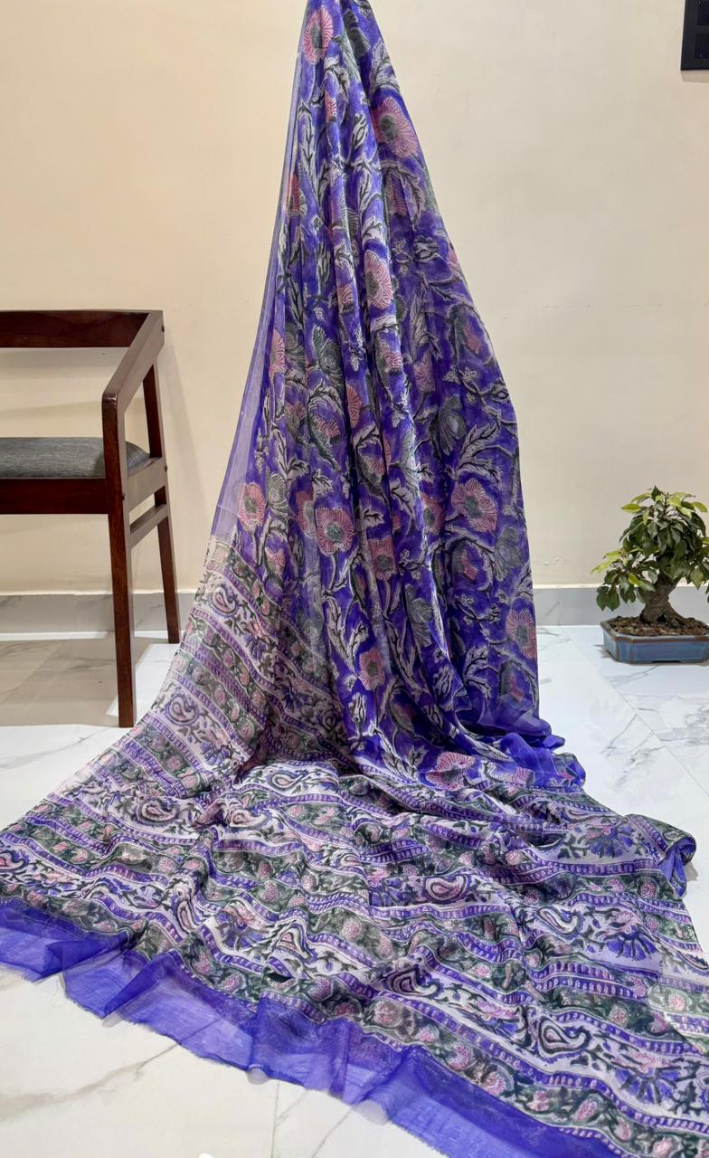 Indulge in the ethereal beauty of hand block printed craftsmanship with this Lavender Blossom Pure Double Diamond Chiffon Saree from Blockart. The intricate floral and paisley patterns exude traditional charm, while the premium quality chiffon fabric drapes elegantly, offering sheer comfort and style. This saree is 5.5 meters long, accompanied by a 1-meter blouse piece, making it a perfect choice for special occasions and celebrations.