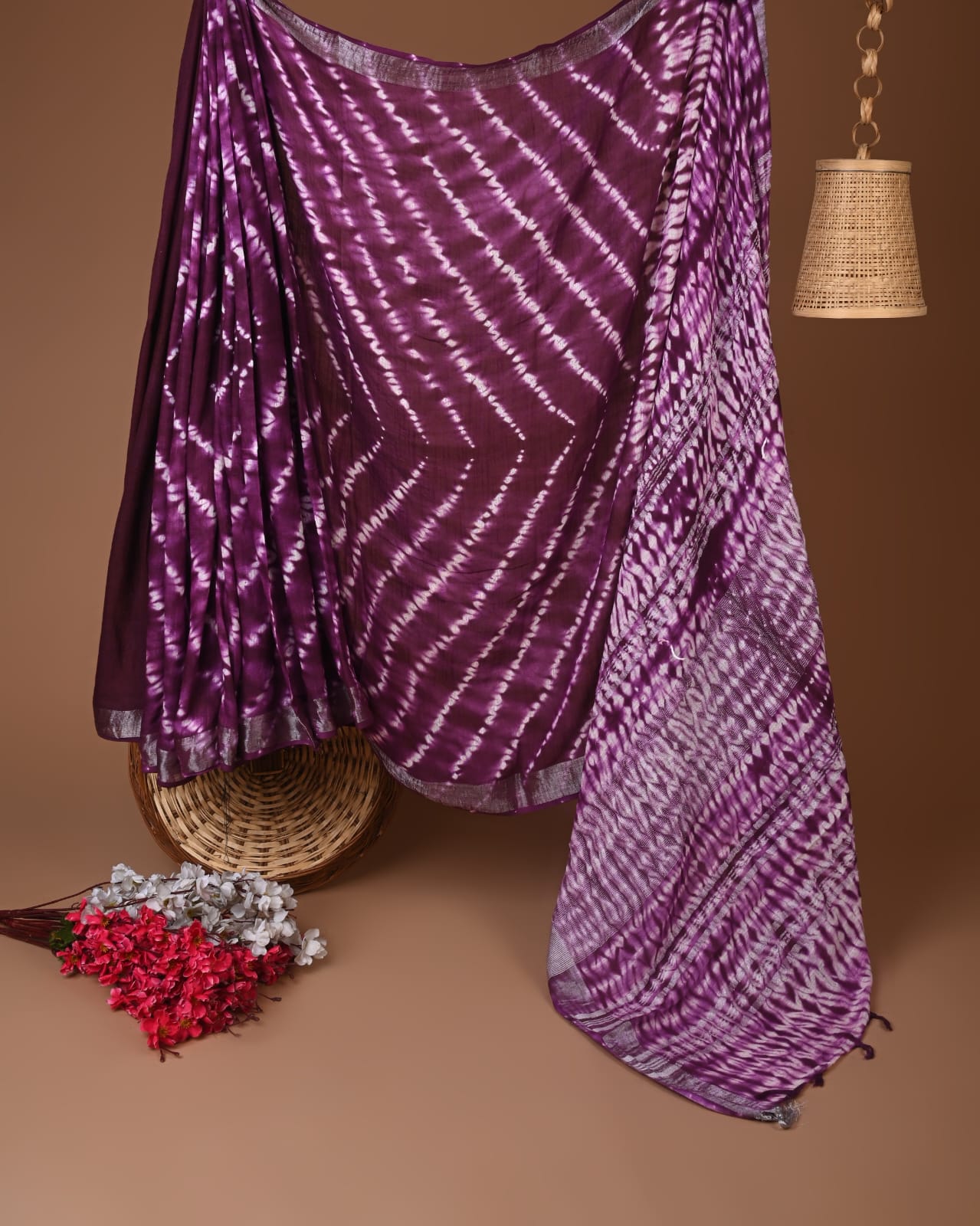 Crafted lovingly, our Lavender Cascade Tie-Dye Linen Saree captures the essence of artisanal craftsmanship with a contemporary twist. The gradient of deep purples elegantly transitions to soft lavender, highlighted by vibrant white accents that add a striking contrast. This unique piece features a mesmerizing tie-dye pattern, with flowing diagonal streaks that create a dynamic visual rhythm, making each wear feel special and unique.