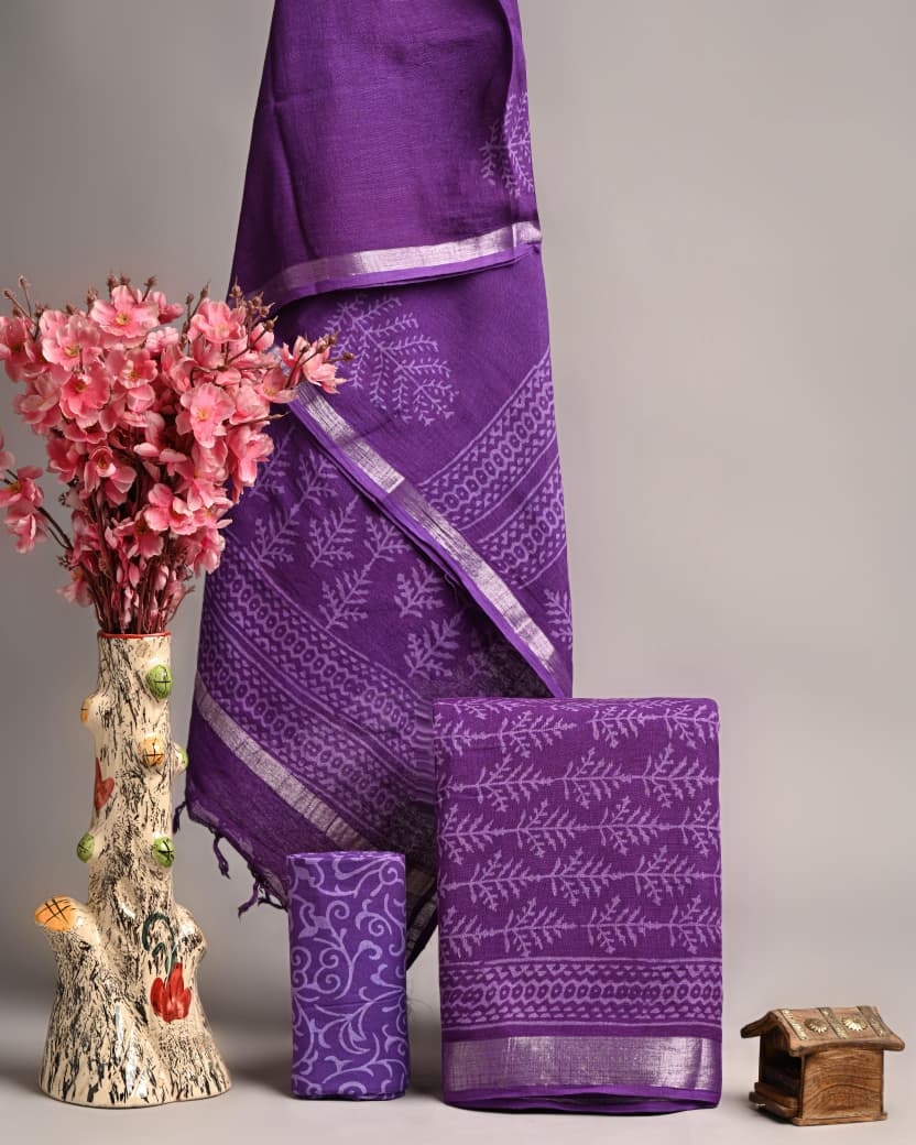 Elevate your ethnic wardrobe with this exquisite Lavender Fern Hand Block Linen Cotton Suit Set. Crafted with precision, the top and dupatta feature intricate fern-like designs and geometric borders with a touch of metallic silver. The soft, breathable linen cotton fabric ensures comfort all day long. Embrace the artistry of Bagru hand block printing in this premium ensemble.