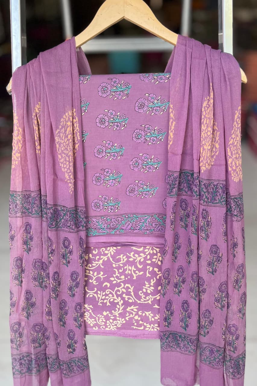 Immerse yourself in the charm of this Lavender Floral Delight Cotton Suit Set, a beautiful representation of the artistry found in Indian textiles. Crafted from 100% pure cotton, this unstitched three-piece dress material features intricate hand block prints that breathe life into your daily or festive wardrobe.