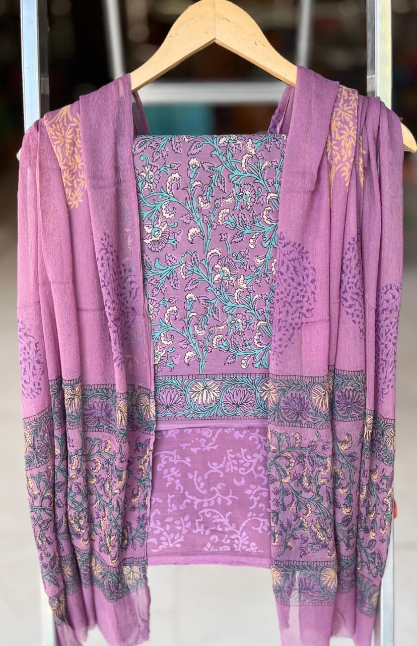 Step into a world where heritage meets modernity with the Lavender Floral Harmony Cotton Suit Set. This beautiful textile showcases a gentle lavender hue interwoven with intricate floral patterns that tell a story of traditional Indian artistry. The delicate motifs dance across the fabric, inviting you to celebrate the elegance of timeless craftsmanship.