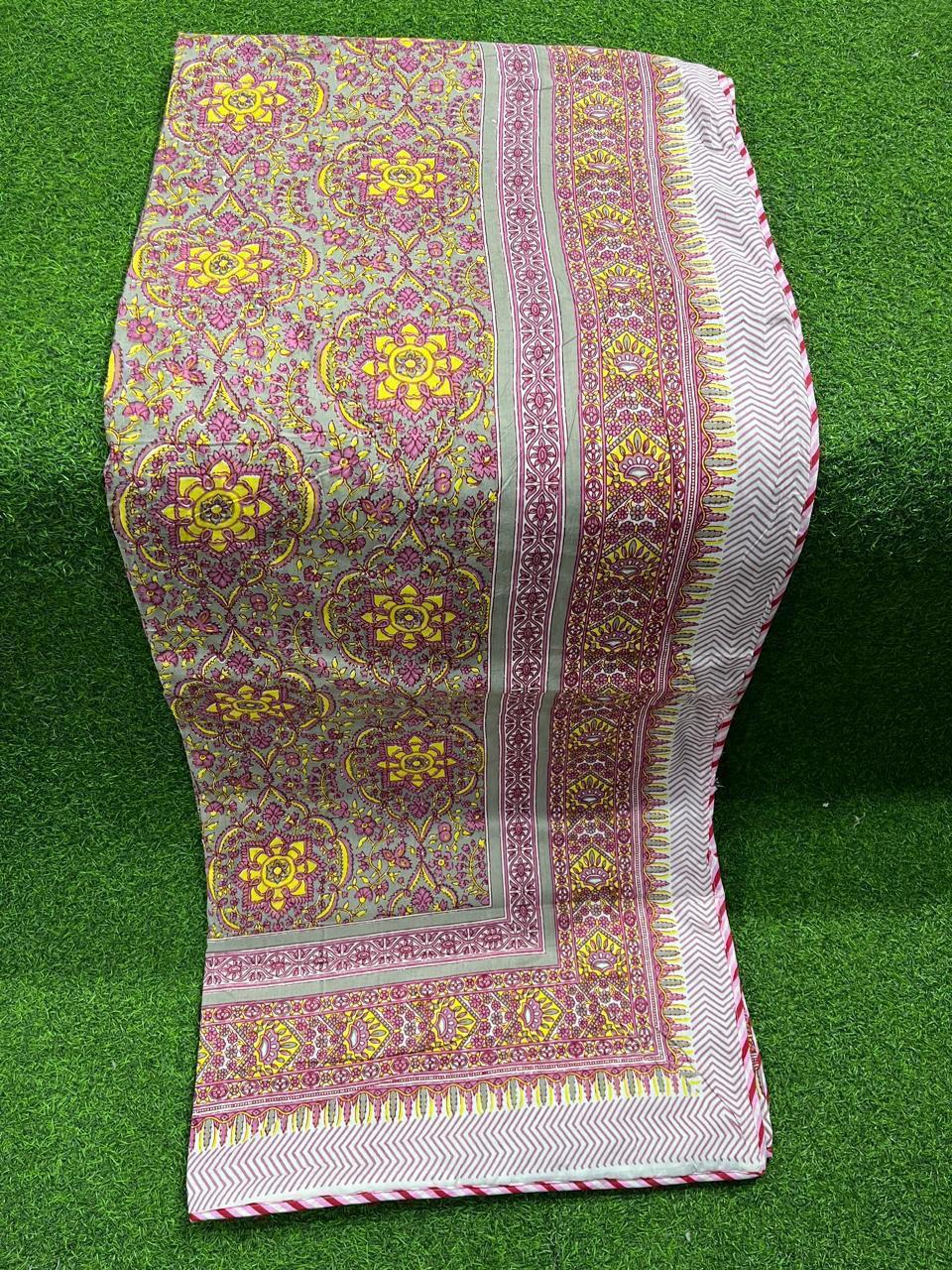 Every stitch tells a story in our Lavender Floral Herringbone Dohar, a piece that effortlessly marries timeless design with modern living. The soft lavender backdrop, adorned with vibrant sunflower yellow blooms and deep magenta accents, creates a playful yet serene atmosphere.