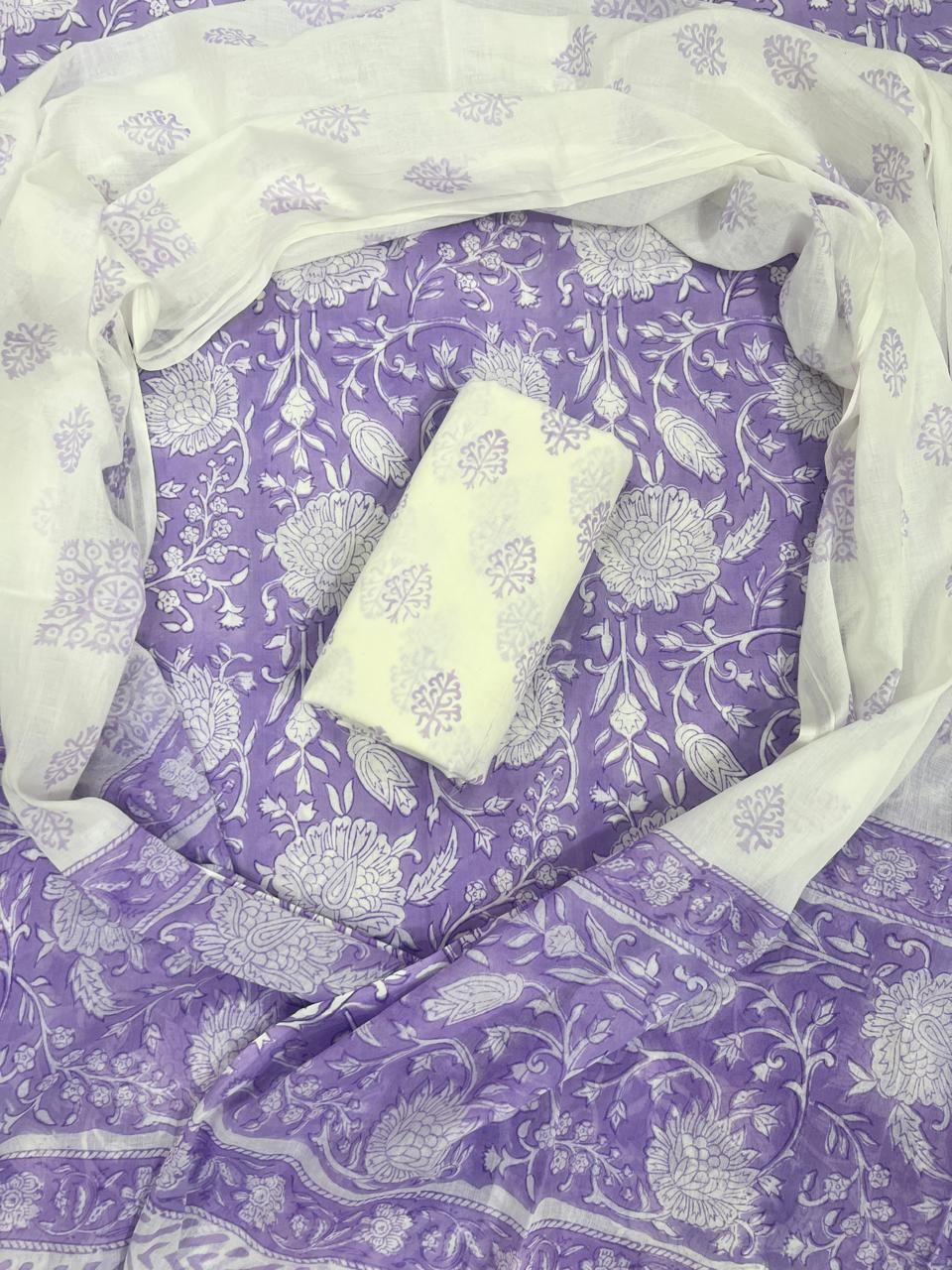 Indulge in the charm of our Lavender Floral Reverie Cotton Suit Set, where delicate blooms dance across a soft lilac canvas. This unstitched three-piece ensemble is artisan-crafted from 100% pure cotton, ensuring comfort and breathability for any occasion. The intricate hand block prints, reminiscent of traditional Indian artistry, add a unique touch to your wardrobe.