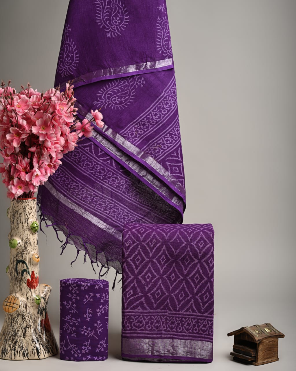 Elevate your ethnic wardrobe with this exquisite Lavender Paisley Linen Cotton Suit Set. Hand block printed with intricate traditional patterns and adorned with a silver border, this set exudes elegance and charm. The top and dupatta crafted from Linen Cotton offer a luxurious feel, while the cotton bottom ensures comfort. Immerse yourself in the artistry of Indian craftsmanship with this premium ensemble.