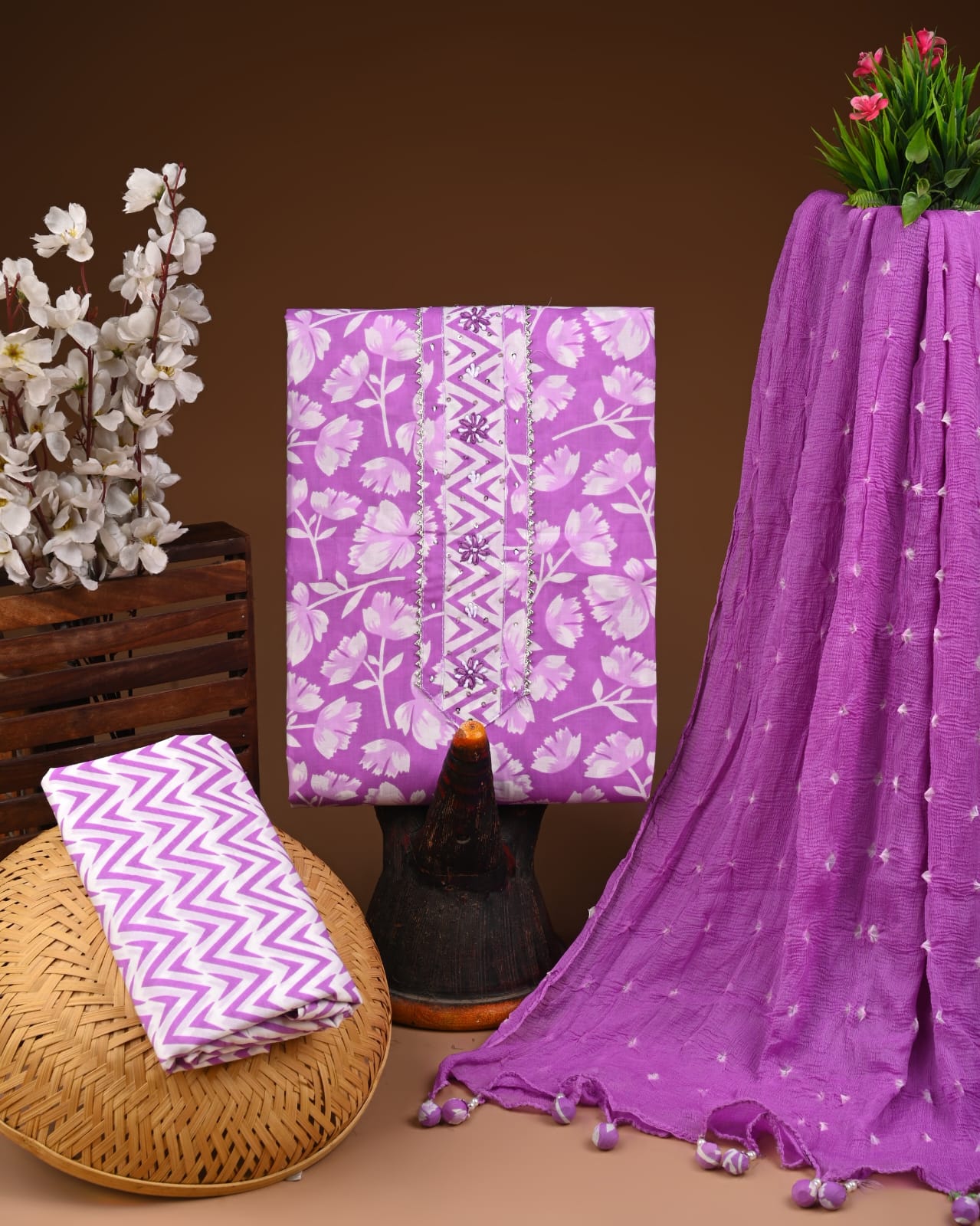 Delve into the charm of artisanal craftsmanship with our Lavender Tulip Zigzag Gota Patti Cotton Suit Set. This enchanting ensemble showcases delicate floral motifs that bloom against a soft lavender base, harmonizing effortlessly with a playful zigzag pattern. The vibrant colors and intricate designs invite you to embrace tradition while making a contemporary statement.