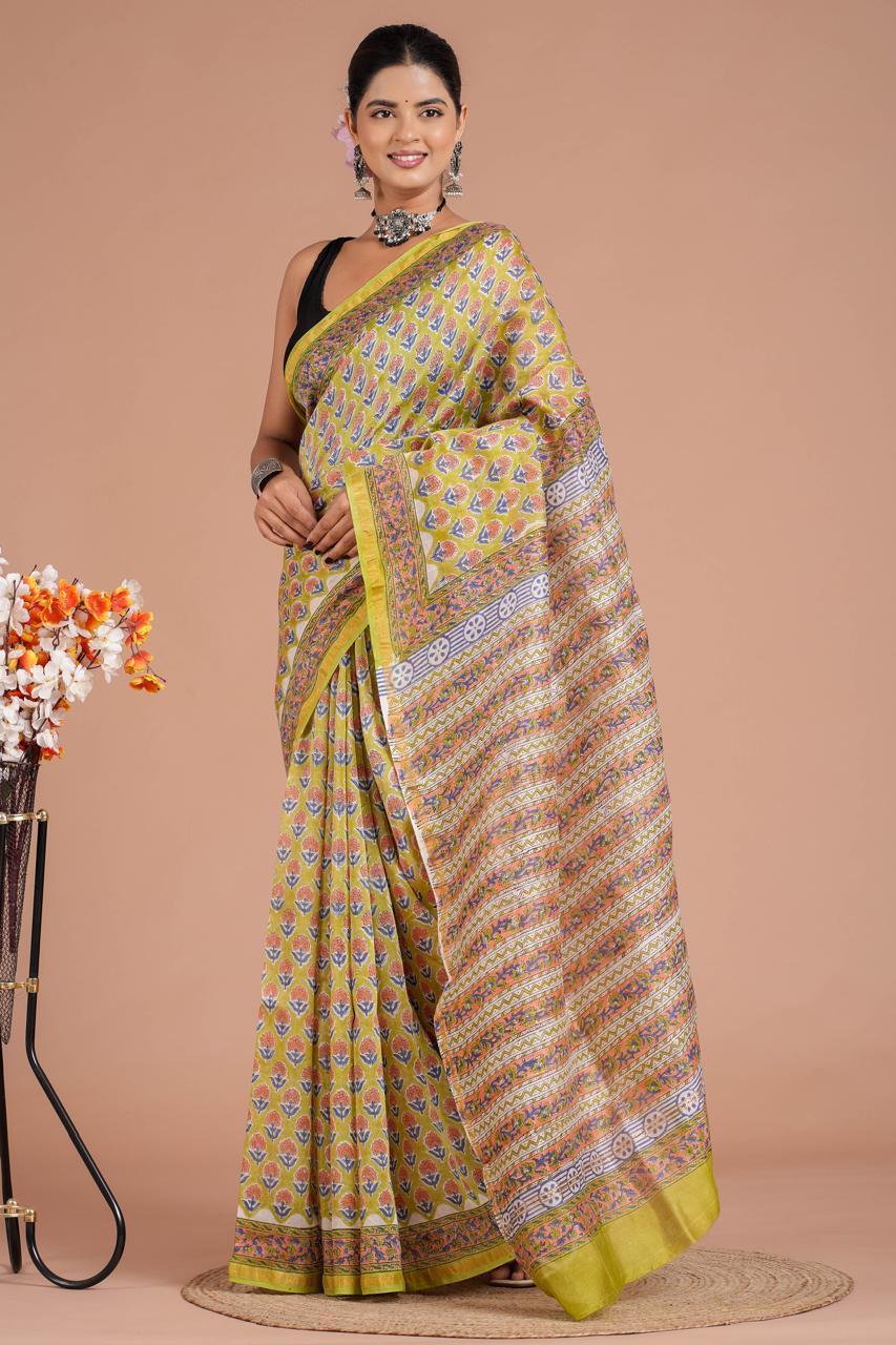 This exquisite saree in a vibrant lime green hue showcases a stunning floral pattern that beautifully intertwines with geometric designs, creating a visual feast for the eyes. Crafted from pure Chanderi silk, its lightweight and lustrous texture drapes gracefully, allowing you to move with ease.