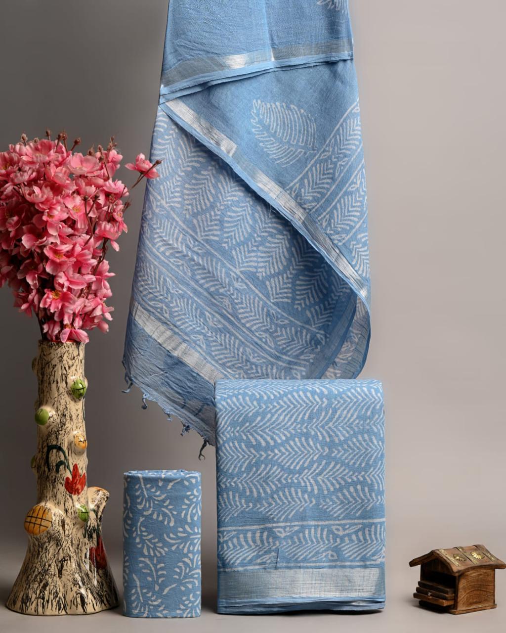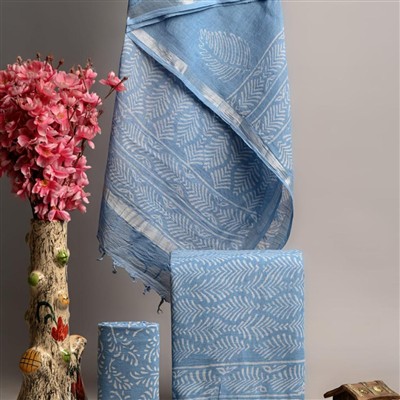 Elevate your wardrobe with this exquisite handcrafted Linen Leaf Vine Suit Set. Crafted with premium linen and cotton fabrics, this set features intricate hand block printing of white leaf and vine patterns, exuding traditional charm. The lightweight and breathable fabric make it perfect for summer wear, ensuring both style and comfort. Embrace the artisanal elegance of Indian craftsmanship with this stunning ensemble.