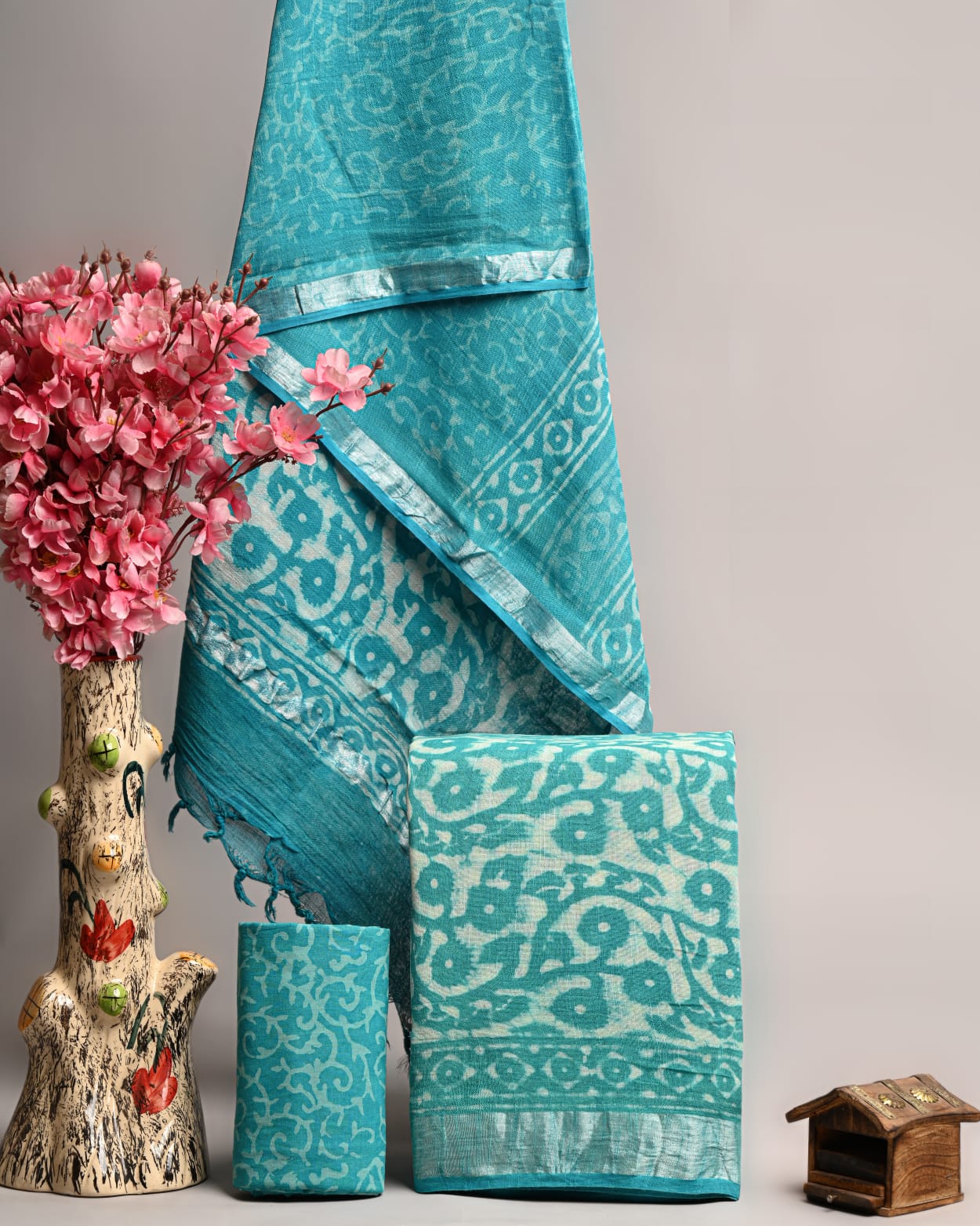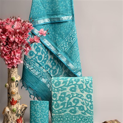 Elevate your ethnic wardrobe with this exquisite trio set from Blockart. Hand block printed on premium Linen and Cotton fabrics, this set exudes traditional craftsmanship and elegance. The intricate floral and abstract patterns in white complement the soothing turquoise base, while the shiny silver borders add a touch of glamour. Perfect for creating stylish and comfortable ethnic outfits for any occasion.