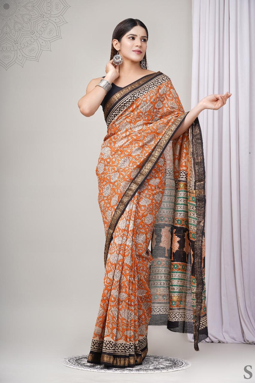 Experience the charm of Indian heritage with this luxurious Maheshwari silk saree, embellished with intricate hand block print detailing. The fine silk weave provides a soft, smooth texture that drapes elegantly, making it perfect for both grand occasions and intimate celebrations. Each motif is hand-printed using traditional wooden blocks, a labor-intensive process that results in rich, authentic patterns unique to every saree. The natural sheen of Maheshwari silk, combined with the beauty of handcrafted prints, creates a piece that is both eye-catching and timeless. This saree comes with a matching blouse piece, ensuring a complete and coordinated ensemble. Its lightweight nature ensures all-day comfort without compromising on style. Whether you’re attending a wedding, hosting a festive gathering, or adding to your collection of heirloom textiles, this saree stands as a testament to skilled craftsmanship and cultural elegance