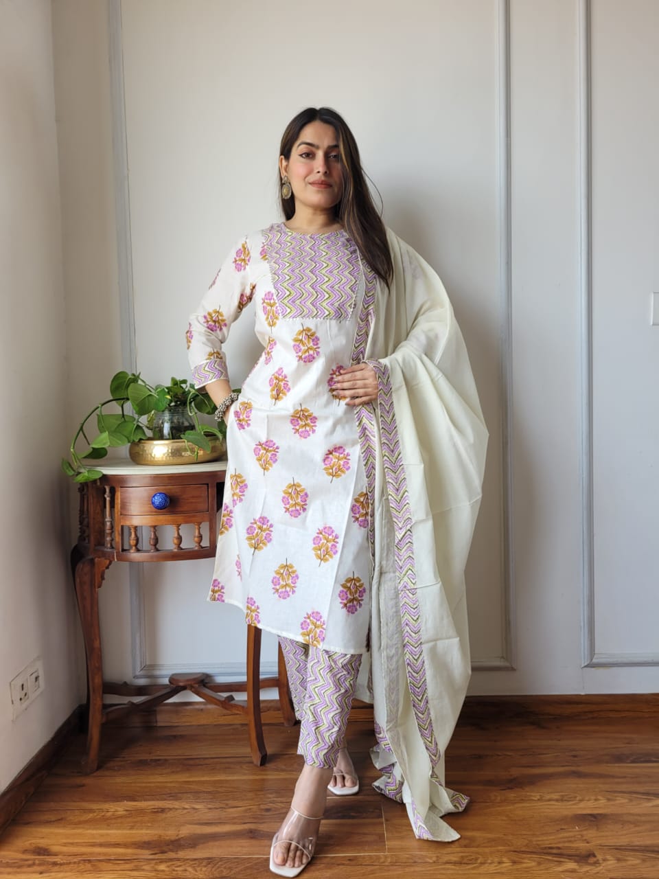 This exquisite ensemble features a stitched kurti with a square-shaped yoke adorned with symmetrical florals and a chic zigzag design gracing the neckline and cuffs. Paired with a comfortable cotton pant and a matching dupatta, this suit set is designed to flow gracefully with your movements, making it an ideal companion for festive gatherings or leisurely day outings.