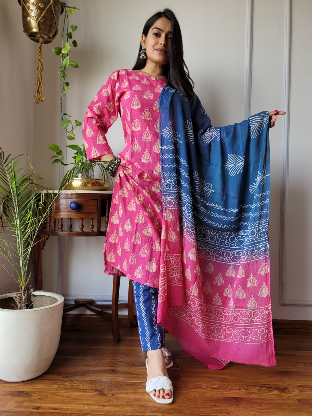 Rooted in the heart of Indian craftsmanship, the Magenta Floral Delight Cotton Suit Set is a stunning representation of traditional artistry. This enchanting ensemble features a beautifully crafted kurti adorned with delicate floral motifs, reflecting the vibrant spirit of nature. The soft cotton fabric is designed to embrace you in comfort, making it an ideal choice for warm days or casual gatherings.