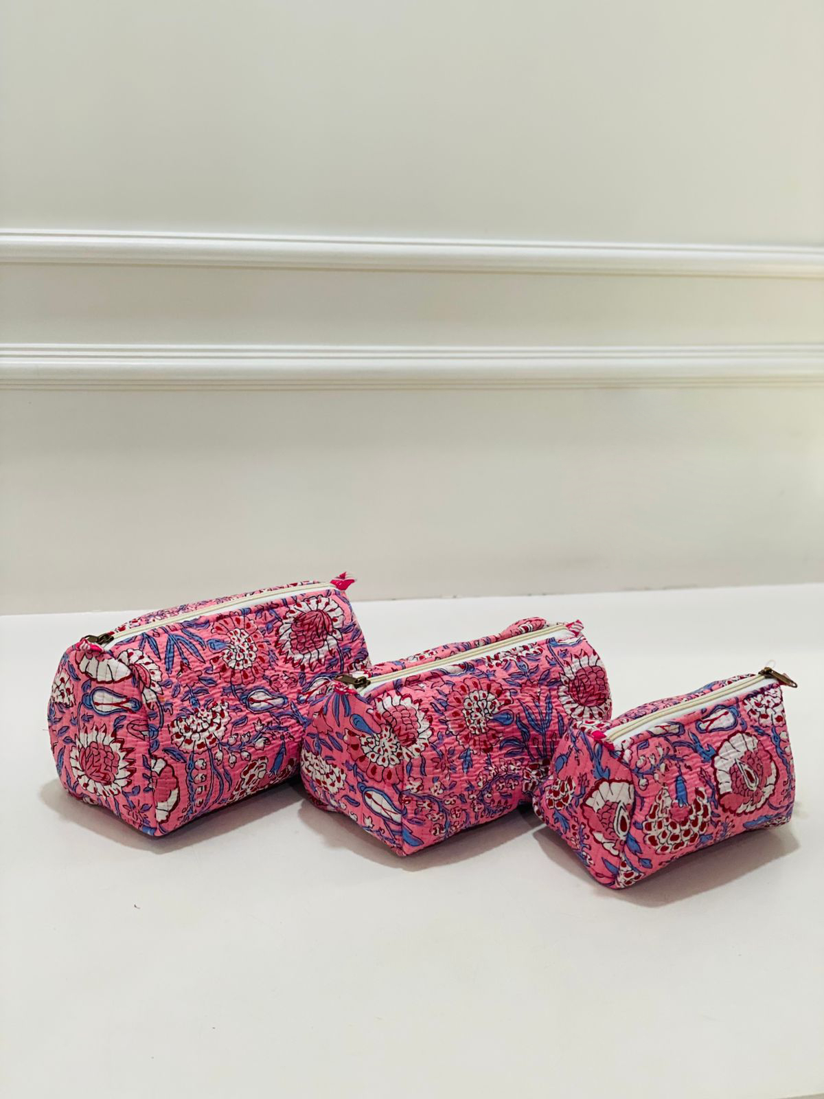 Rooted in the traditions of Indian textile artistry, this striking magenta floral quilt set embodies the essence of hand block printing. Each pouch is a canvas of intricate botanical designs, harmoniously combining vibrant hues of deep blue and crimson that dance across the fabric in a celebration of nature.