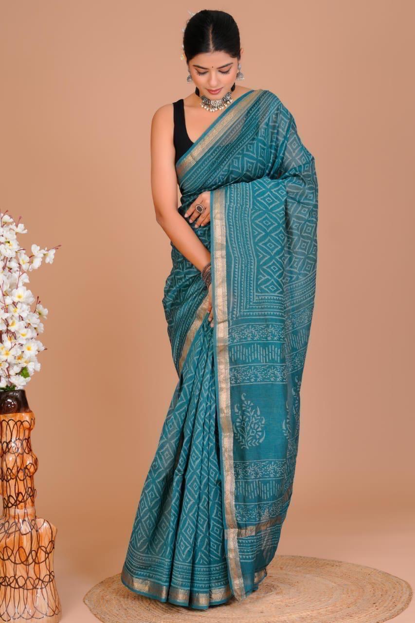Indulge in the allure of traditional Indian craftsmanship with our Maheshwari Silk Blue Floral Border Saree. Crafted with the finest silk blend fabric, this saree drapes elegantly, offering a luxurious feel against your skin. Each delicate floral and geometric pattern is meticulously hand block printed, reflecting the artistry of our skilled artisans. The teal blue hue, complemented by a gold border, adds a touch of regal charm to your ensemble. Embrace the comfort and breathability of this saree, perfect for formal events or festive occasions.