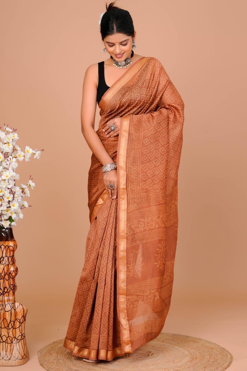 Indulge in the luxury of our Maheshwari silk saree, where tradition meets sophistication. Crafted with care, this saree features intricate floral motifs and geometric shapes that narrate tales of Indian heritage. The soft, smooth texture of silk drapes gracefully, offering a regal touch to your ensemble. The broad golden border adds a touch of opulence, making it a perfect choice for special occasions. Embrace the cultural significance of hand block printing as you adorn yourself with this masterpiece. The warm copper hue complements various skin tones, adding a radiant glow to your look. Pair it with traditional silver jewelry for a complete ethnic ensemble. Care for this exquisite piece by dry cleaning only to preserve its beauty for years to come.