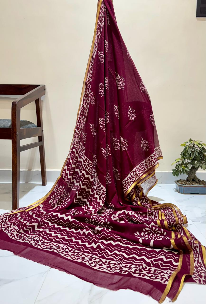 Experience the elegance of hand block printing with our Maroon Blossom Silk Saree. Crafted from Pure Double Diamond chiffon with bemberg silk, this saree features intricate white floral and leafy motifs on a maroon backdrop. The golden borders add a touch of luxury, while the pallu showcases zigzag and floral patterns. Embrace comfort and style with this artisanal creation.