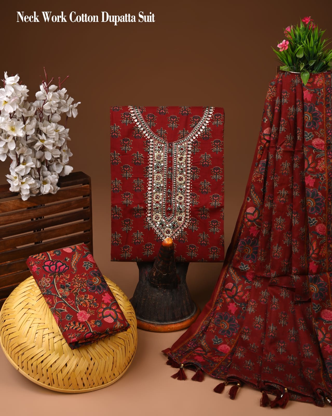 Searching for a unique ensemble that brings together rich tradition and modern flair? Look no further than this exquisite maroon floral cotton suit set. With its deep burgundy base adorned with coral pink and mustard yellow floral motifs, this piece captures the essence of artisanal craftsmanship.