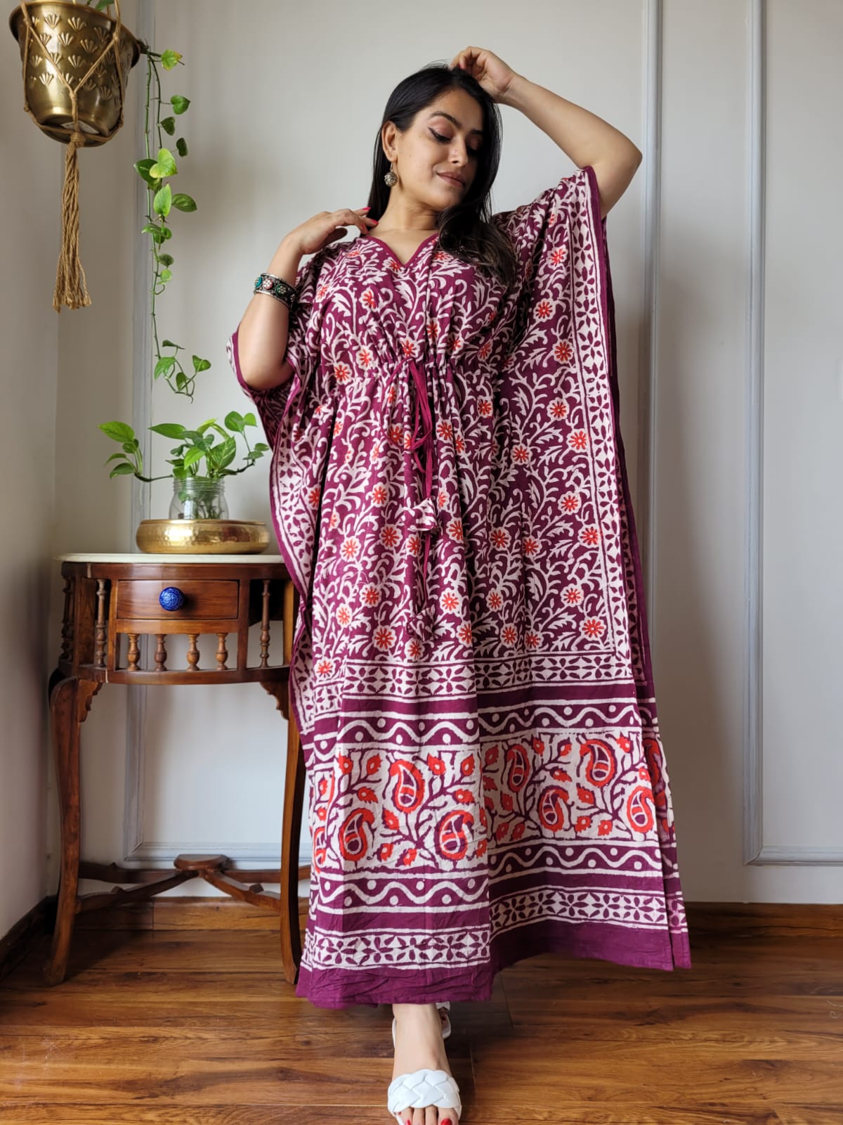 Indulge in the beauty of hand block printing with our Maroon Paisley Bliss Cotton Kaftan Dress. Crafted from 100% pure cotton, this free-size dress features intricate floral and paisley patterns in white and orange, exuding traditional charm. The loose, flowing fit, V-neckline, and adjustable drawstring waist offer both comfort and style. Elevate your ethnic wardrobe with this artisanal piece that is perfect for any occasion.