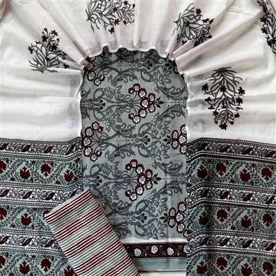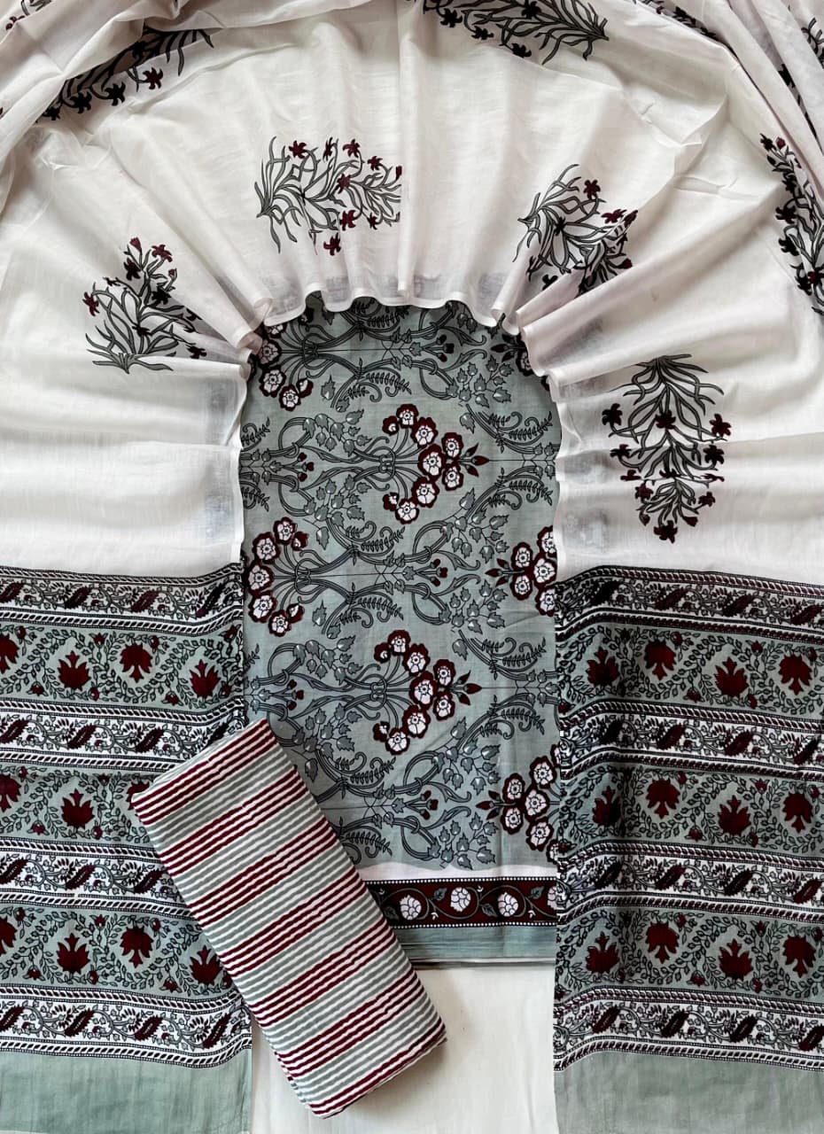 Indulge in the timeless art of hand block printing with our Maroon Vine Cotton Suit Set. Crafted from premium cotton fabric, this set features intricate floral motifs in maroon and black on off-white fabric, complemented by a greyish-green piece with a detailed vine pattern. The striped fabric adds a touch of elegance with maroon, white, and grey hues. Embrace comfort and style with this traditional ensemble.
