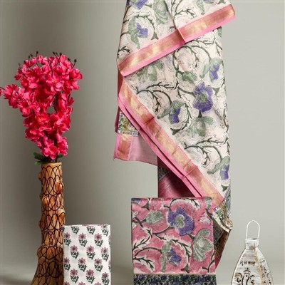 Discover the artistry behind the Mauve and Pink Blossom Silk Maheshwari Suit Ensemble, inspired by traditional Indian textile techniques. Handcrafted with attention, this ensemble showcases intricate floral patterns in shades of mauve, pink, and green on a lustrous silk blend fabric. Ideal for various occasions, the ensemble offers a versatile style that connects to India's rich cultural heritage. The unique color combinations and the soft texture of the fabric make it a statement piece for your wardrobe, allowing you to explore different ways of wearing it.