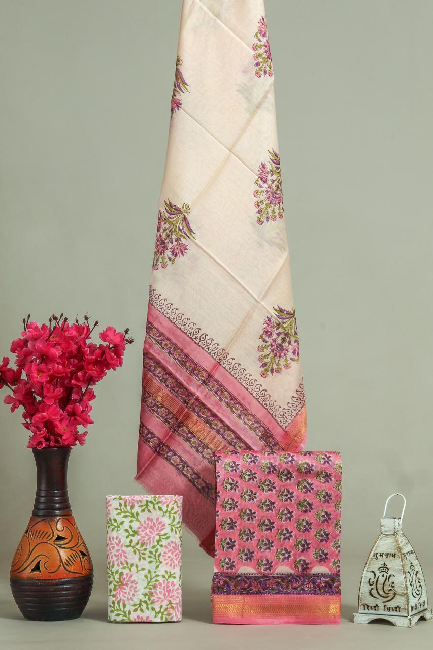 Indulge in the ethereal beauty of the Mauve Blooms Maheswari Silk Ensemble Set, a tribute to traditional Indian craftsmanship. The off-white fabric adorned with delicate pink, purple, and green floral prints exudes grace and sophistication. Crafted with attention to detail, this cotton blend ensemble offers a luxurious texture and a comfortable drape.