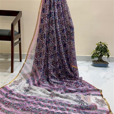 Indulge in the exquisite charm of hand block printing with our Mauve Blossom Double Diamond Chiffon Saree. Crafted from pure double diamond chiffon with bemberg silk, this saree drapes elegantly and exudes a premium feel. The intricate floral patterns in shades of blue, maroon, and green on a mauve backdrop create a mesmerizing visual appeal. The soft and flowy texture ensures comfort all day long. Elevate your ethnic wardrobe with this artisanal masterpiece.