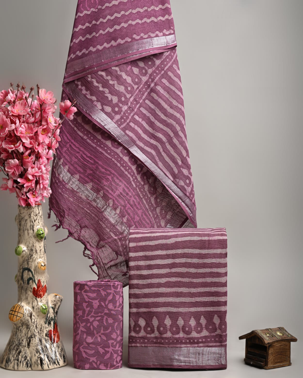 Elevate your ethnic wardrobe with this exquisite hand block printed linen cotton suit set from Blockart. Crafted with precision, the set features a rich mauve hue with intricate traditional motifs. The top and dupatta in linen cotton offer a luxurious feel, while the cotton bottom ensures comfort all day long. The silver border adds a touch of elegance, making it a perfect choice for special occasions.