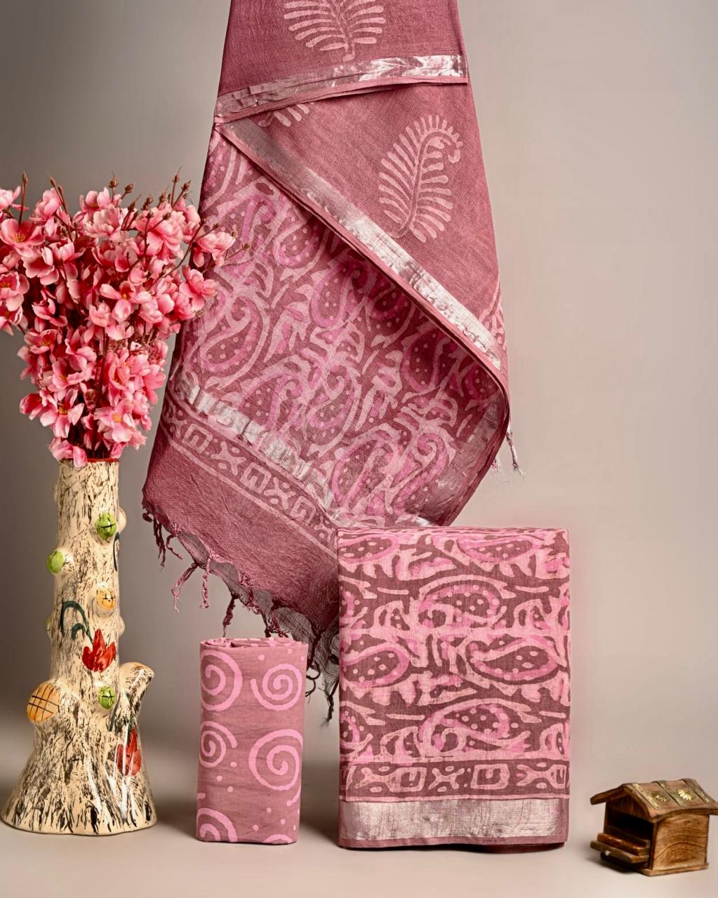 Elevate your ethnic wardrobe with this exquisite hand block printed linen suit set. The top and dupatta feature intricate paisley and swirl motifs in shades of mauve, complemented by a silver border for a touch of elegance. Crafted from high-quality linen cotton fabric, this set offers both style and comfort. Embrace the artistry of traditional block printing with this premium ensemble.