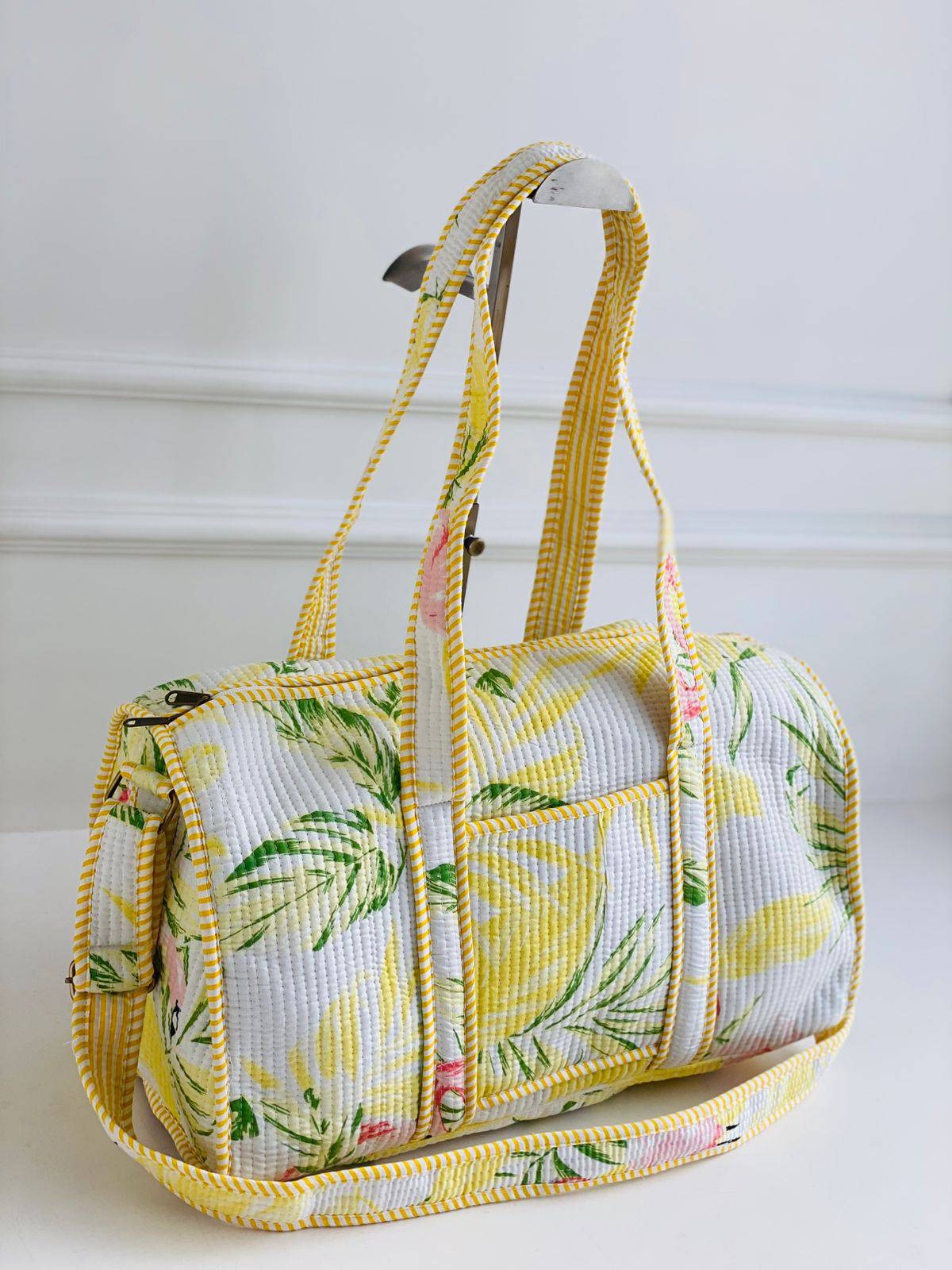 Immerse yourself in the artisans inspiration with this handcrafted quilted duffle bag from Blockart. Each piece showcases the traditional Indian printing technique, creating a mellow meadow of yellow and green florals on a textured cotton blend fabric. Versatile in style, this medium-sized bag offers various carrying options with its long handles, adjustable shoulder strap, and zippered closure. Dive into the cultural heritage of Indian crafts with this unique piece that blends tradition with modern utility.