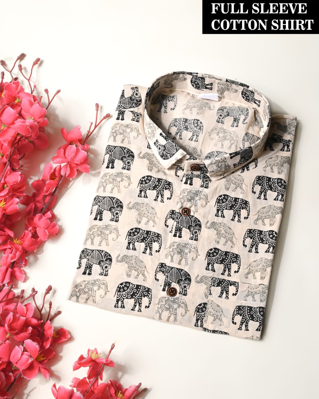 Make a bold yet classic statement with this full-sleeve shirt for men. The light beige base is adorned with a detailed black and gray elephant print, offering a unique and artistic design that pays homage to the majestic animals of Rajasthan. Made from soft and breathable cotton, this shirt is designed for all-day comfort, making it ideal for the warm and vibrant atmosphere of Jaipur. The regular fit and button-down style make it a versatile piece that can be worn for various occasions. Pair it with your favorite denim or chinos for a stylish and contemporary look that is both comfortable and sophisticated.