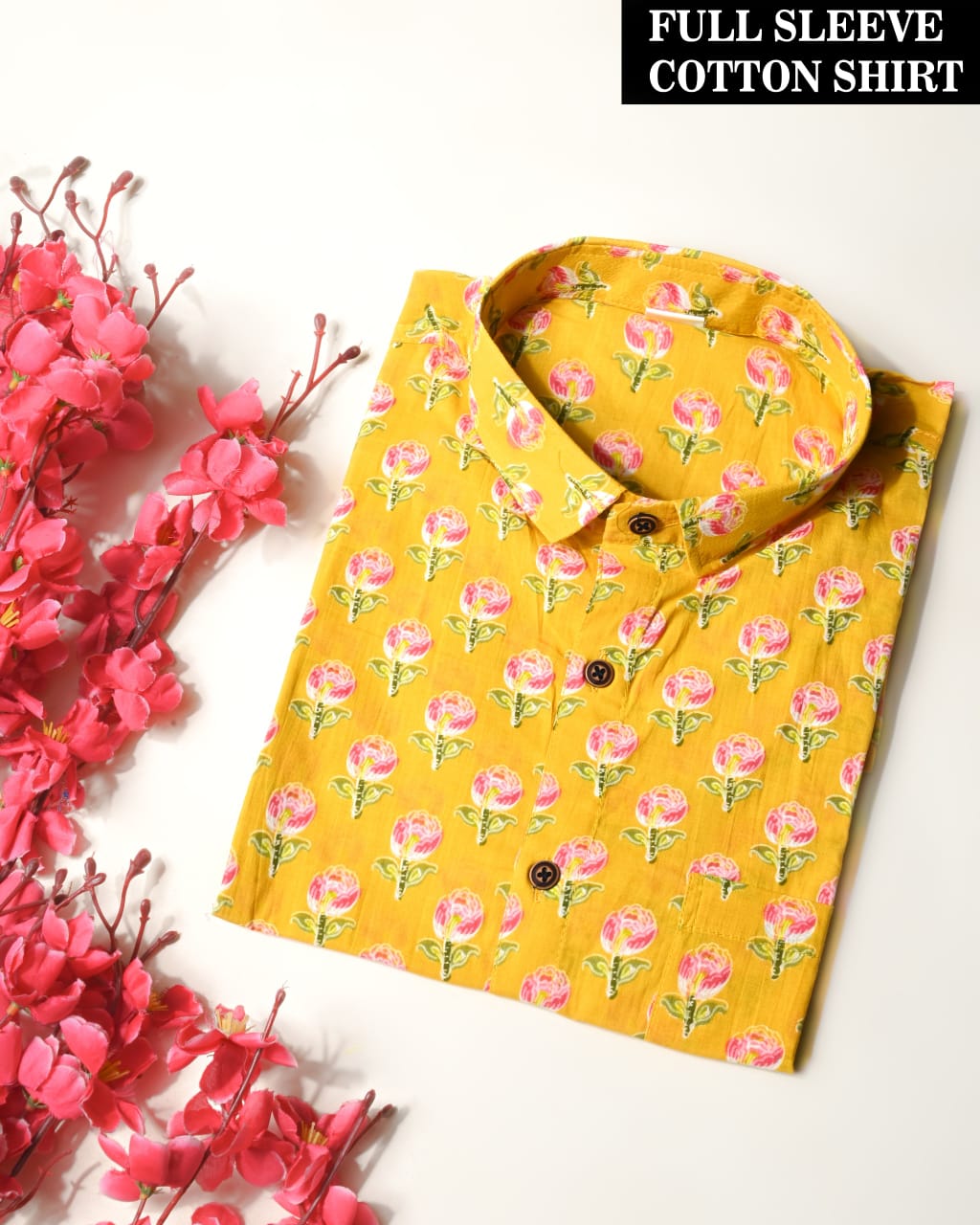 Elevate your style with this vibrant and comfortable full-sleeve shirt for men. Crafted from soft, breathable cotton, this shirt features a striking yellow base adorned with a delicate pink and green floral print. The classic button-down design and regular fit make it perfect for both casual outings and semi-formal events. Pair it with jeans or chinos for a fresh, stylish look.