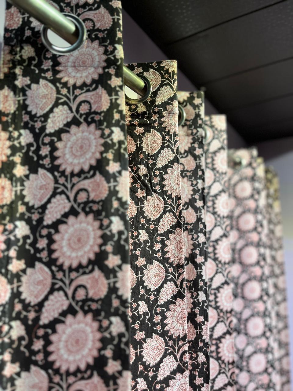 Immerse your living space in the intricate beauty of our Midnight Black Floral Elegance Cotton Curtains. The soft blush pink blossoms, set against a rich black backdrop, evoke a sense of serene sophistication, inviting you to explore the delicate artistry of traditional Indian craft. Each floral motif is meticulously hand block printed, reflecting not only the skill of the artisan but also a deep respect for the heritage of textile artistry.