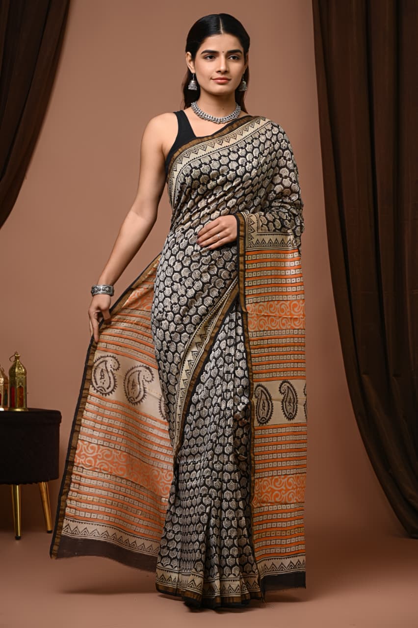Discover the striking allure of our Midnight Black Geometric & Floral Chanderi Silk Saree, where the deep black canvas meets the warmth of burnt orange and cream patterns. This artisan-crafted piece is a celebration of Indian textile artistry, blending traditional hand block printing techniques with a modern aesthetic. The intricate designs, featuring both geometric and floral motifs, create a captivating visual harmony that draws the eye.