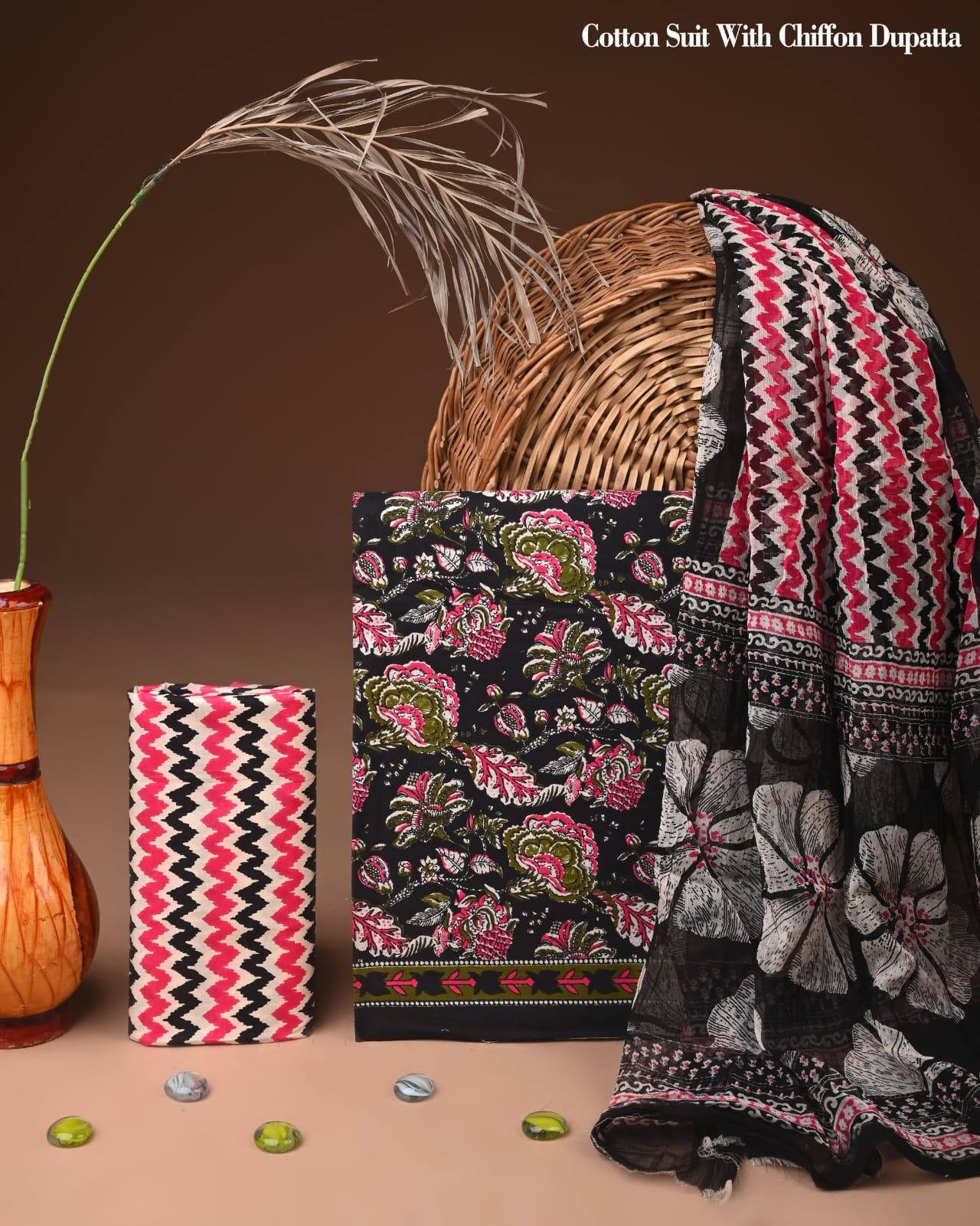 Delve into the charm of artisan craftsmanship with our Midnight Blossom Floral Cotton Suit Set. This enchanting ensemble features a deep black backdrop adorned with intricate floral details in shades of crimson, rose, and sage green, reflecting the skilled hands that brought it to life. The stunning interplay of bold blooms and geometric zigzag patterns strikes a beautiful balance between tradition and contemporary flair.