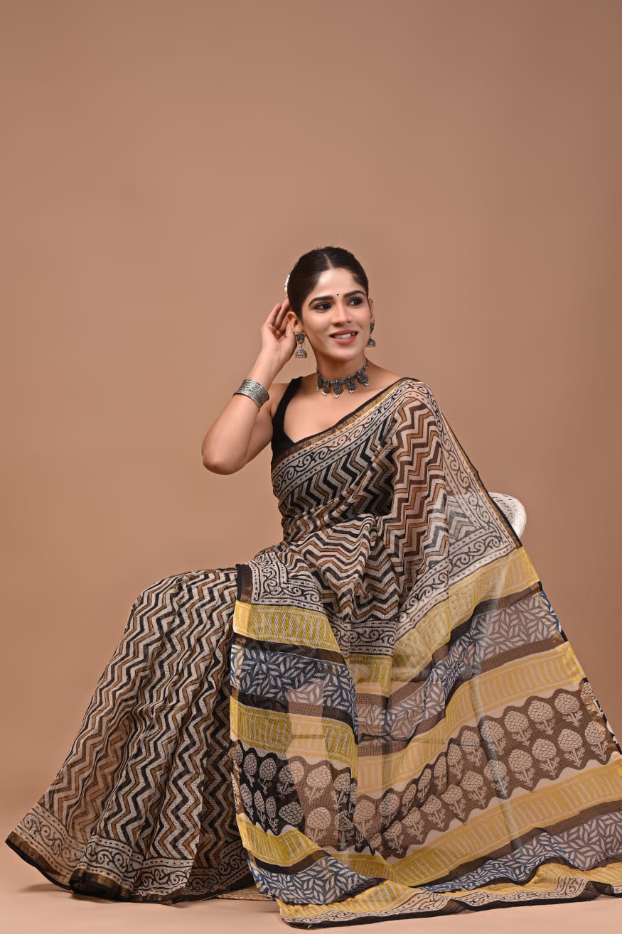 Embody the spirit of sophistication with our Midnight Blossom Geometric Kota Doria Saree. The deep black fabric serves as a canvas for striking geometric patterns and delicate floral motifs, creating a harmonious blend of contemporary design and traditional craftsmanship. Each drape tells a tale, inviting you to explore the intricate artistry of hand block printing.