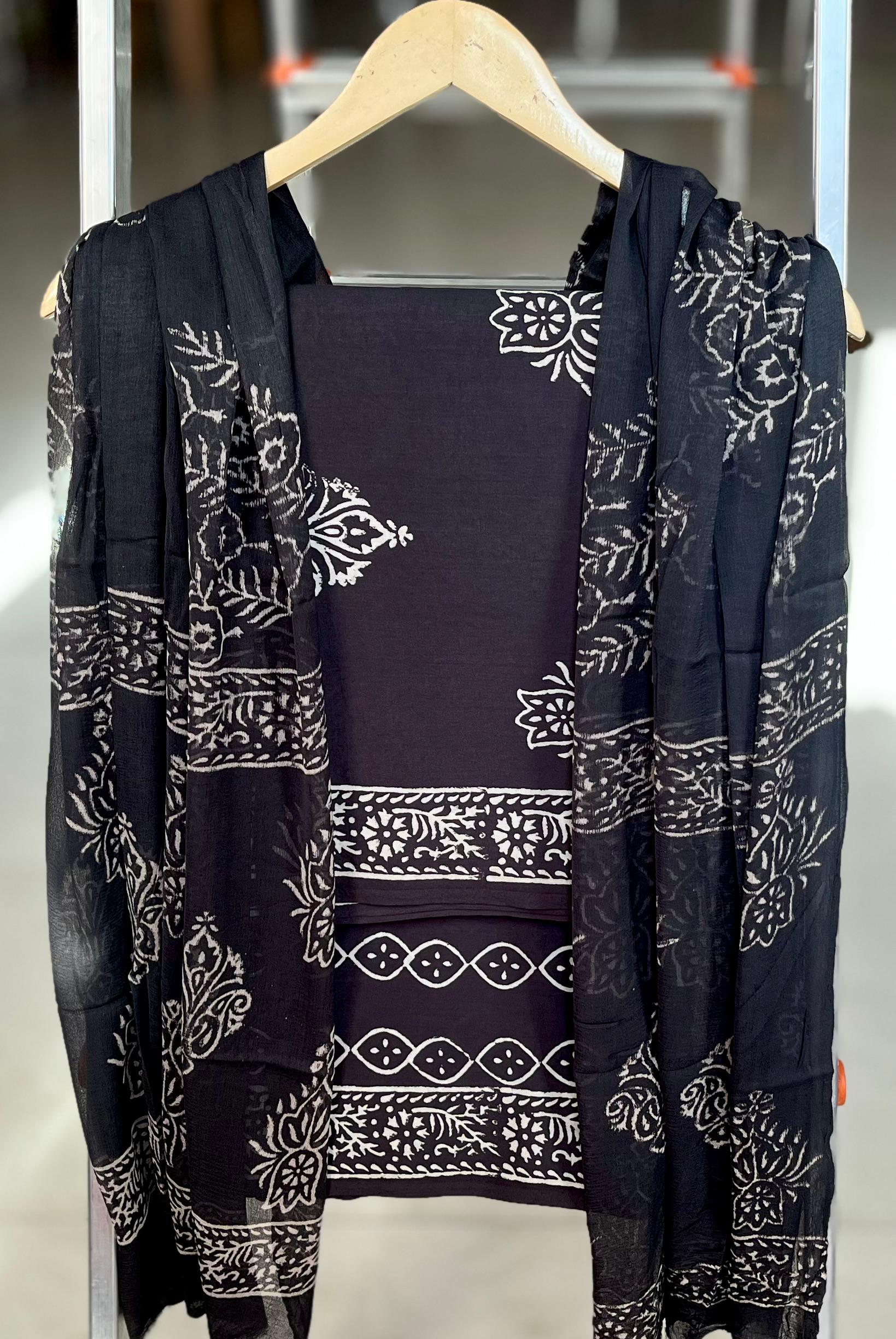 Step into a world where tradition meets modern aesthetics with the Midnight Floral Elegance Cotton Suit Set. Crafted with care, the fabric is adorned with intricate floral motifs alongside striking geometric borders, keeping in tune with the heritage of Indian block printing. The deep black base serves as a canvas for elegant white patterns, lending a fresh yet timeless look.