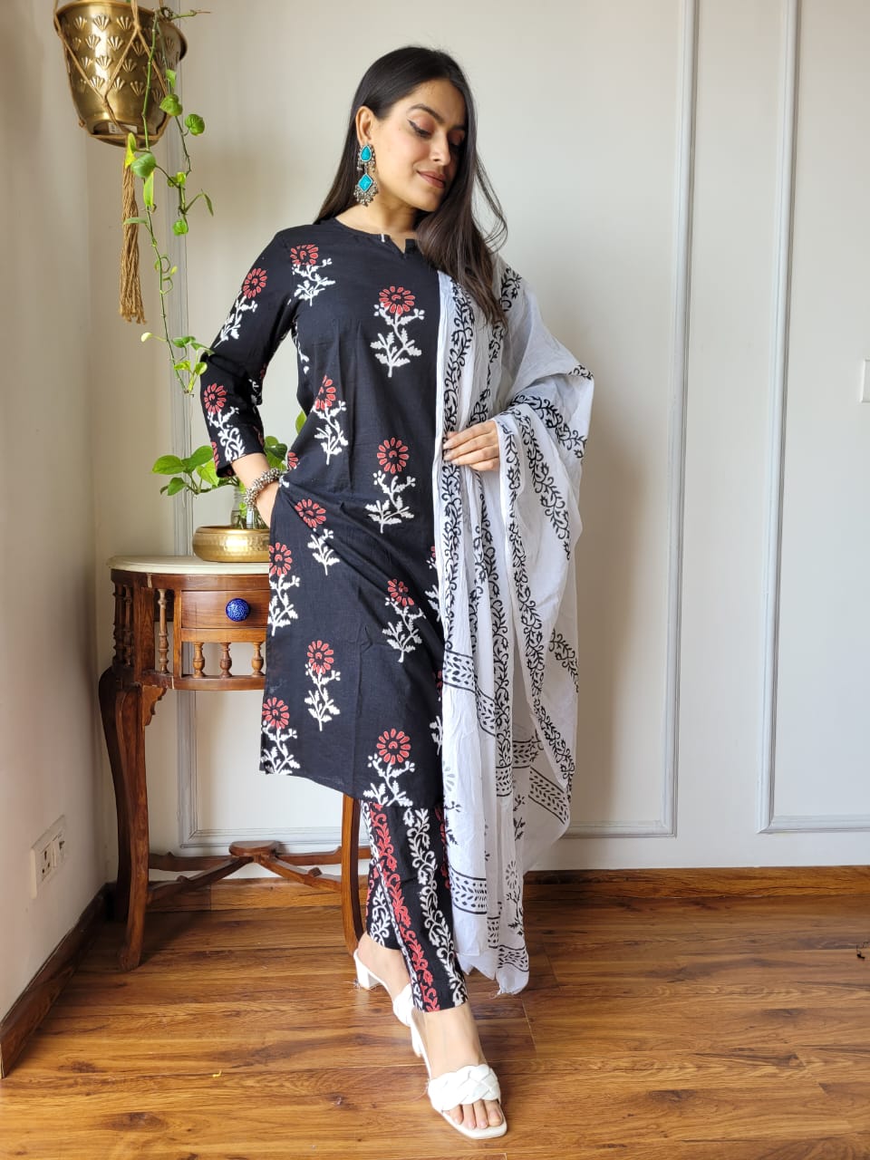 Infuse your wardrobe with the captivating charm of our Midnight Floral Embrace Cotton Suit Set. This piece draws inspiration from the artistry of hand block printing, showcasing an enchanting floral pattern against a rich black canvas. Each print tells a story, honoring the skilled artisans behind its creation.