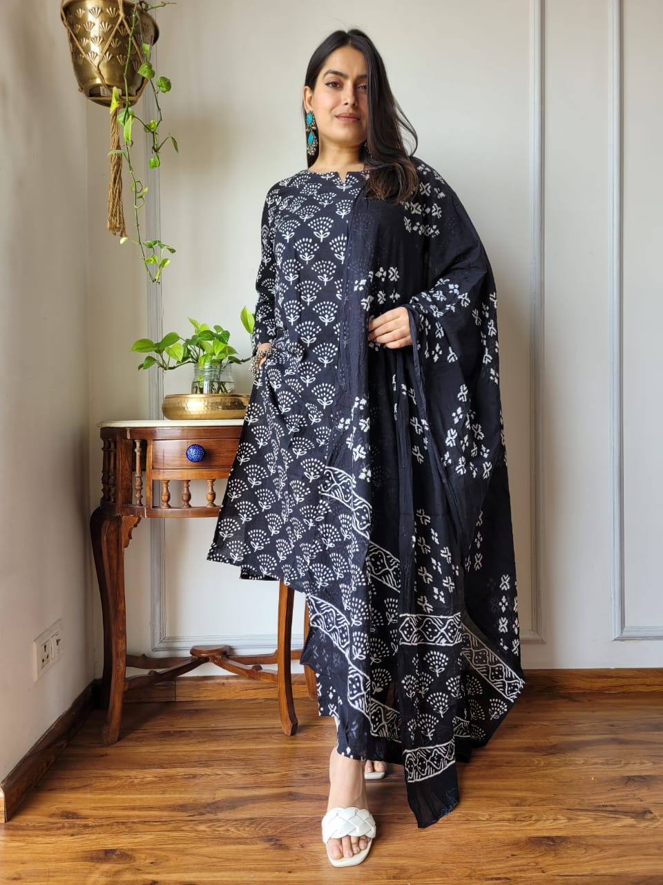 Every thread of this exquisite suit set embodies the timeless artistry of Indian craftsmanship. The deep midnight black fabric serves as a stunning canvas for delicate white floral motifs, expertly hand block printed to create a harmonious blend of tradition and modern elegance.