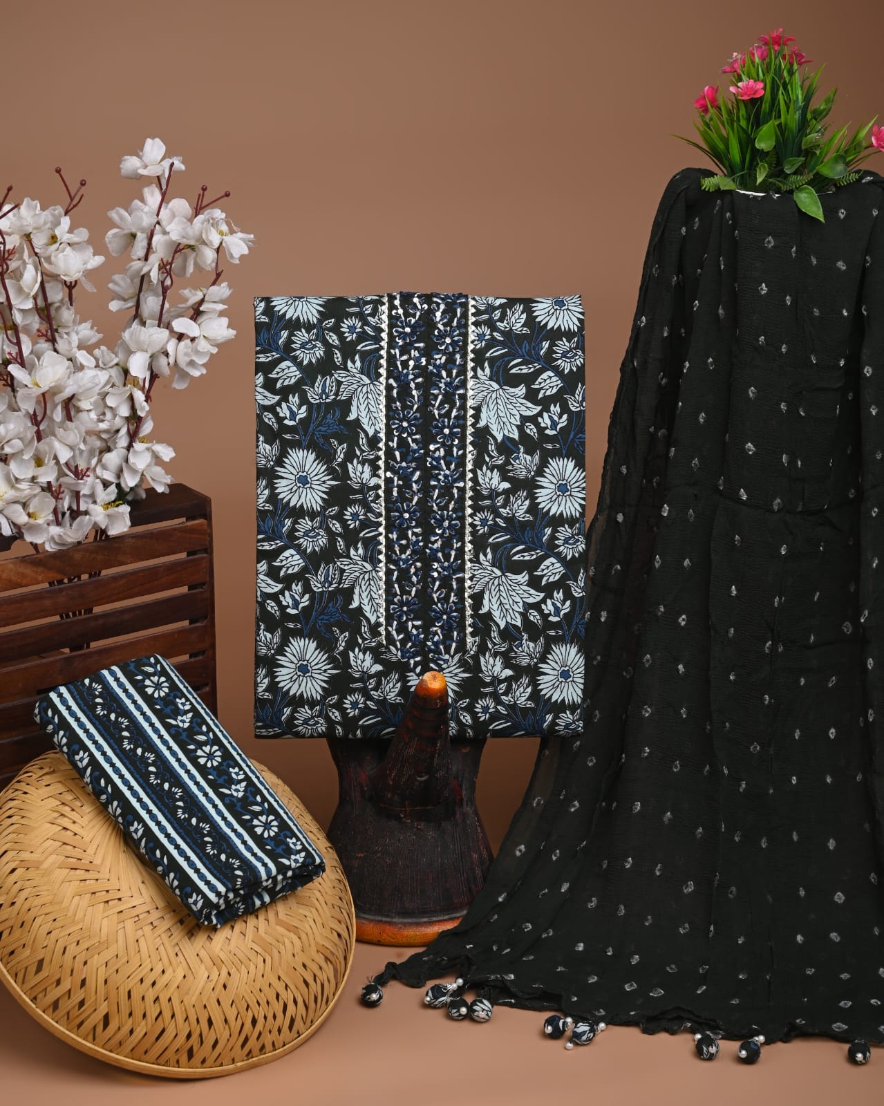 Imagine slipping into this suit set, with its elegant drape and the joyous colors of midnight blooms, making you feel effortlessly chic. A beautifully designed neckline adds a touch of refinement, while the lightweight chiffon dupatta flows gracefully, adding movement to your ensemble.