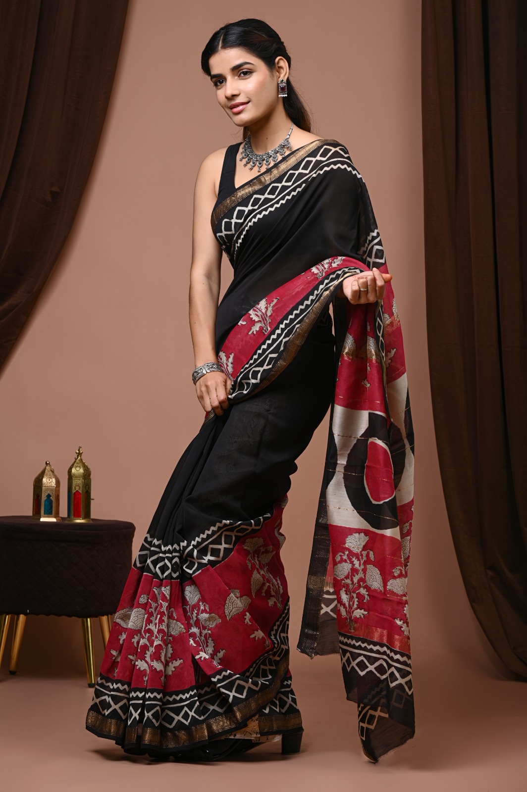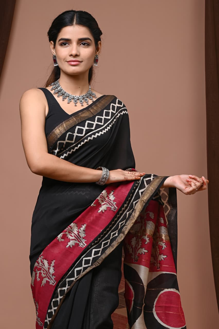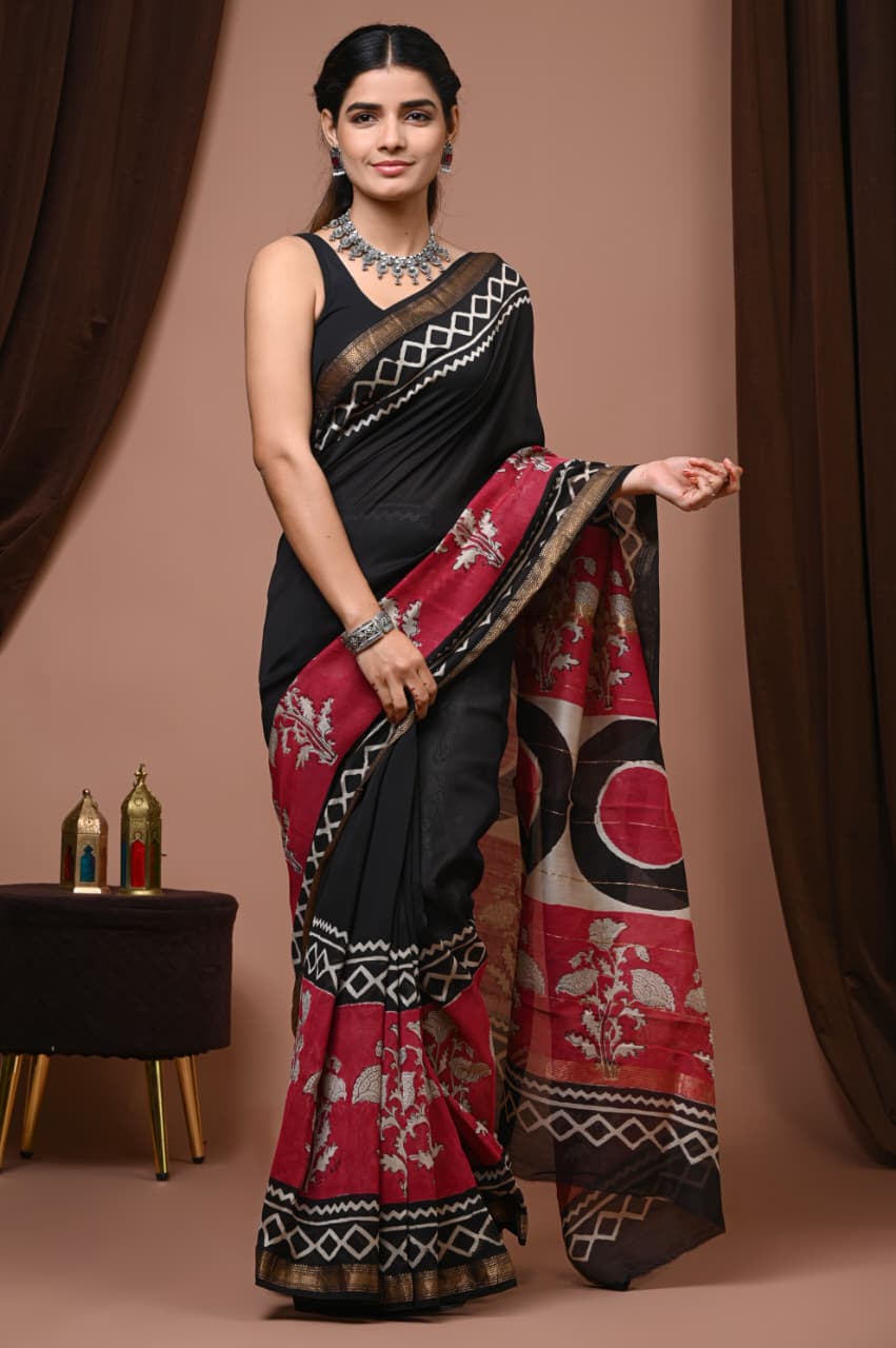 Delve into the enchanting world of our Midnight Floral Maheshwari Silk Saree, a piece that whispers tales of tradition and craftsmanship. This stunning garment is an ode to the rich heritage of Rajasthani artistry, showcasing intricate hand block prints that embody the soul of Indian culture.