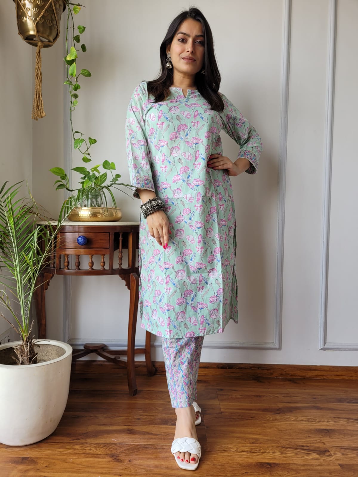 To keep your mint floral set looking its best, hand wash in cold water and dry in the shade. With its understated charm and thoughtful design, this kurti and pant combination is sure to become a cherished staple in your collection.