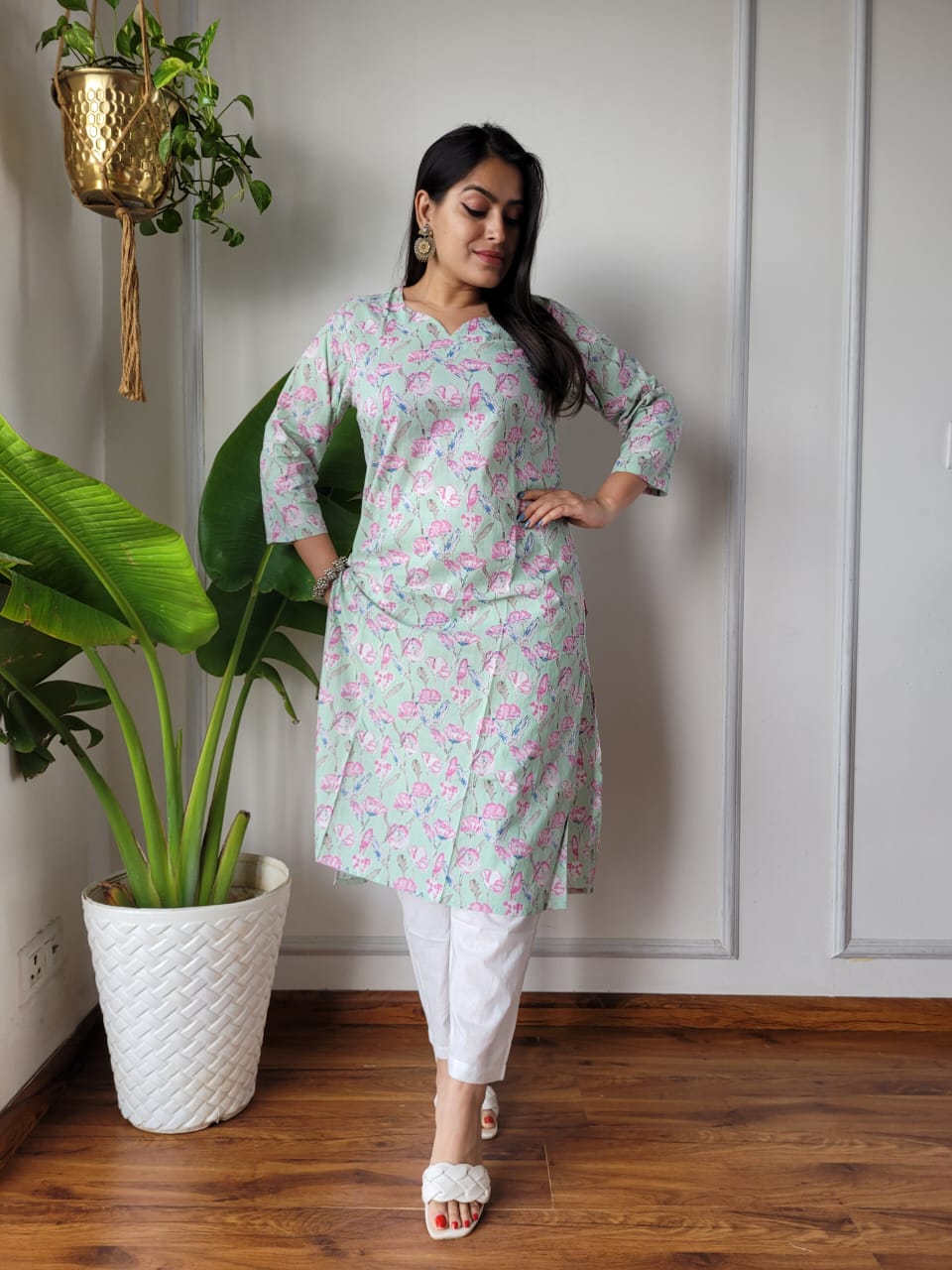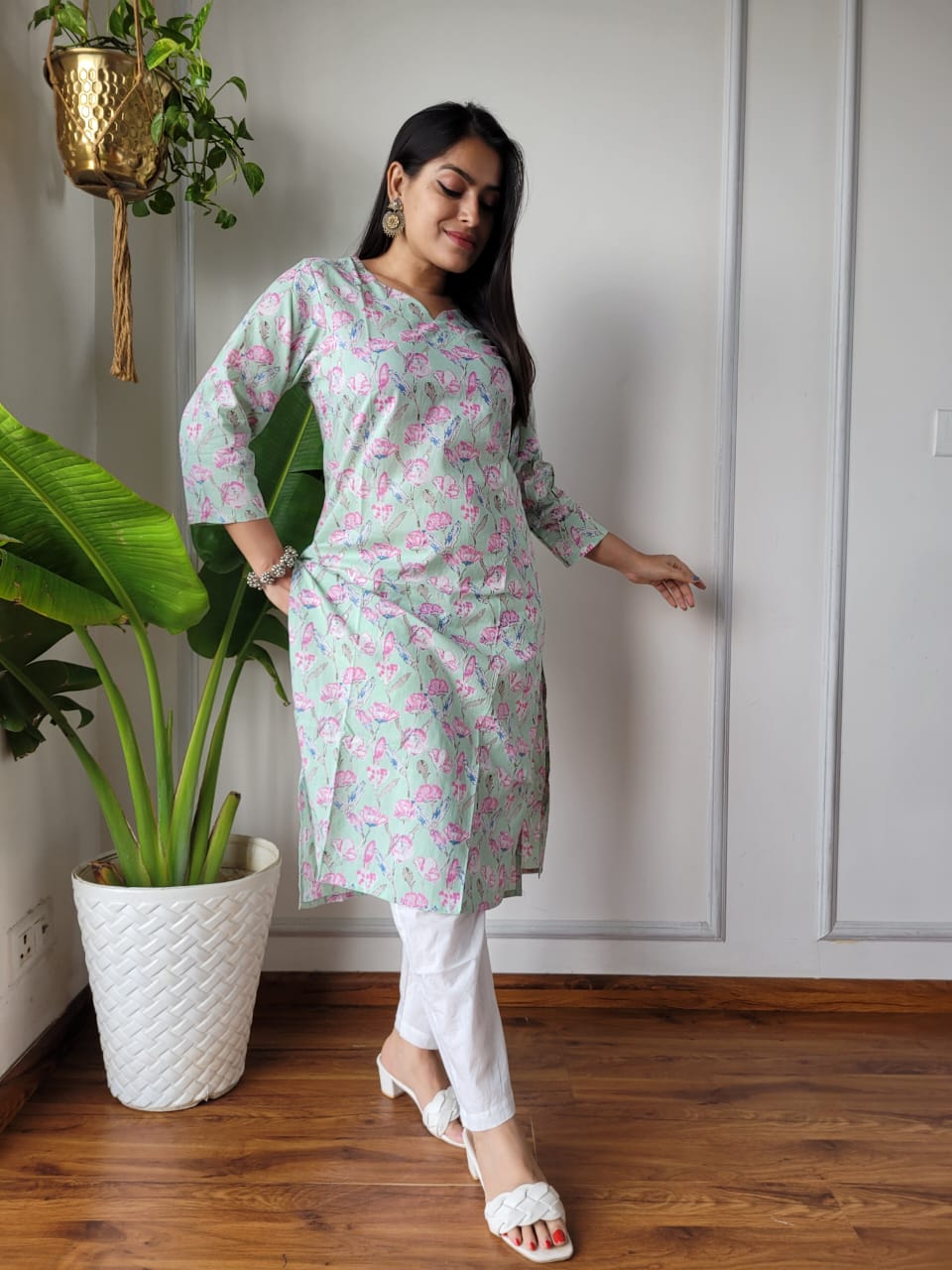Mint Green Blossom Cotton Block Print Kurti with Floral Pattern Detailing