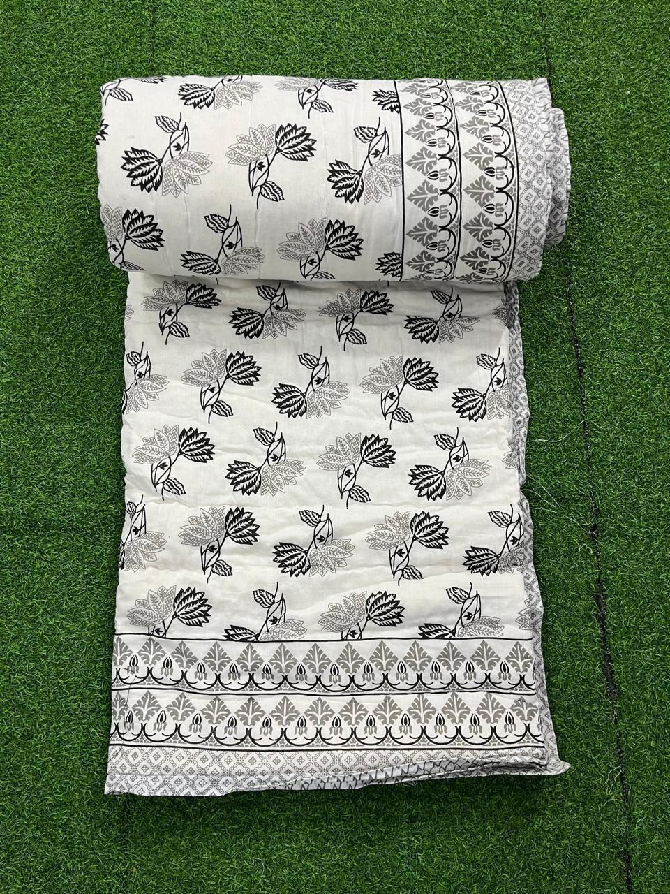 Step into a realm where the beauty of tradition meets the charm of modernity with our Monochrome Floral Elegance Cotton Quilt. This exquisite piece is a testament to the rich heritage of Indian crafting techniques, masterfully showcasing intricate floral patterns interwoven with geometric designs.