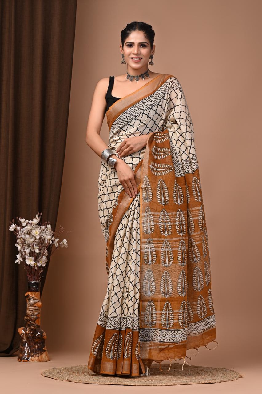 Indulge in the timeless elegance of hand block printing with this exquisite Monochrome Leaf Motif Linen Saree Set from Blockart. Crafted from premium linen fabric, this saree features a graceful blend of geometric and leaf motifs in black on a cream base. The contrasting brown border and pallu add a touch of sophistication, making it perfect for cultural events and festive occasions. The lightweight and sheer fabric ensure comfort while exuding traditional charm.