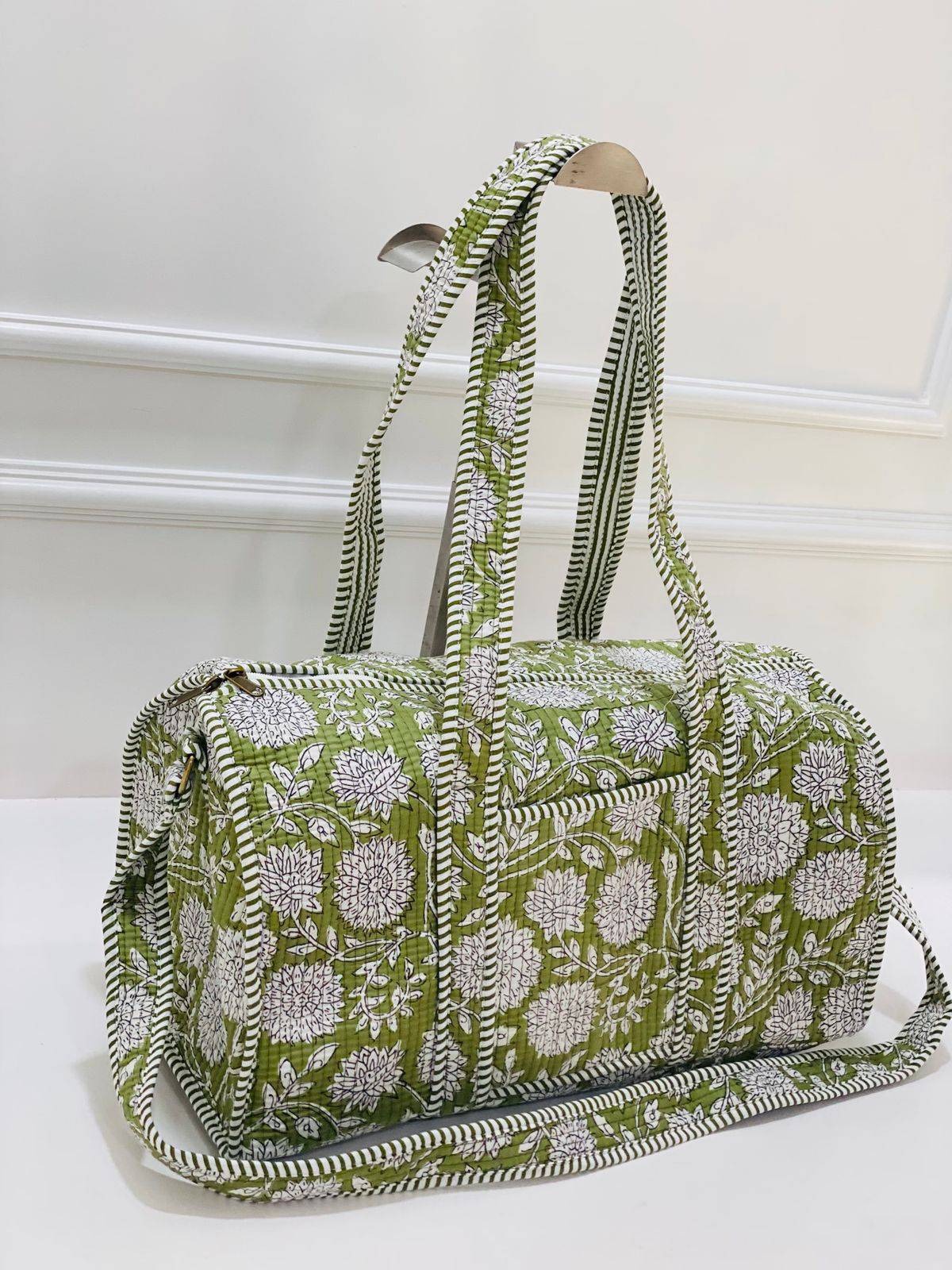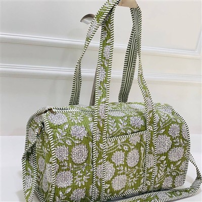Embrace the beauty of nature with this moss green floral quilted duffle bag. The delicate white floral patterns against the green backdrop create a harmonious blend of colors, while the quilted fabric adds a soft, padded texture. The hand block prints showcase traditional artisan techniques, ensuring each piece is unique.