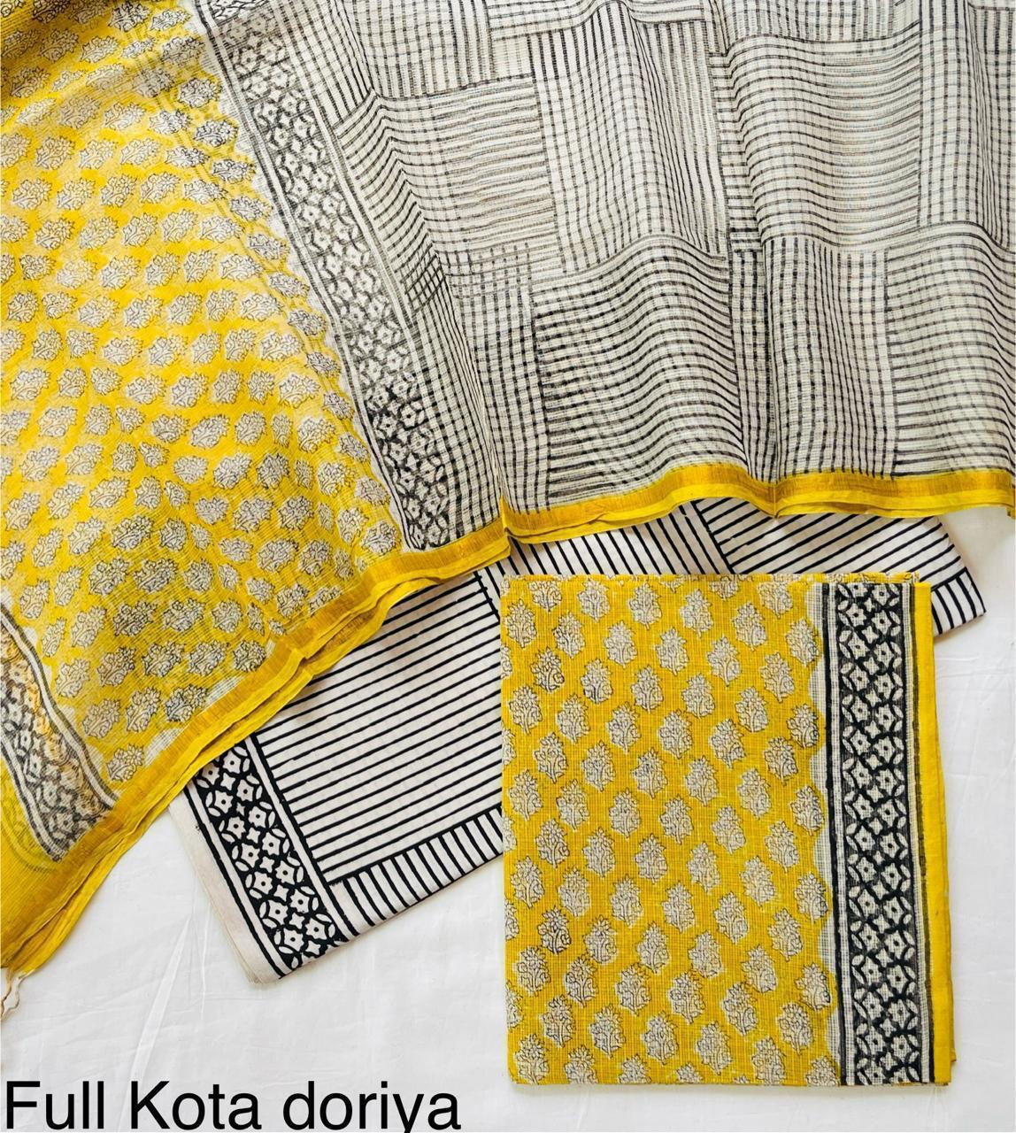 Make a unique statement with this striking suit, featuring a multi-tone block print on authentic Kota Doria fabric. Kota Doria is renowned for its lightweight, airy, and semi-transparent texture, characterized by its distinctive square-check weave. The "multi-tone block print" is the star, showcasing intricate patterns meticulously hand-stamped onto the fabric using carved wooden blocks, where various shades of a single color or harmonious combinations of different colors are used to create depth and dimension. These prints often feature traditional motifs or abstract designs, making each piece a work of art. This suit is perfect for those who appreciate handcrafted uniqueness and sophisticated artistry.