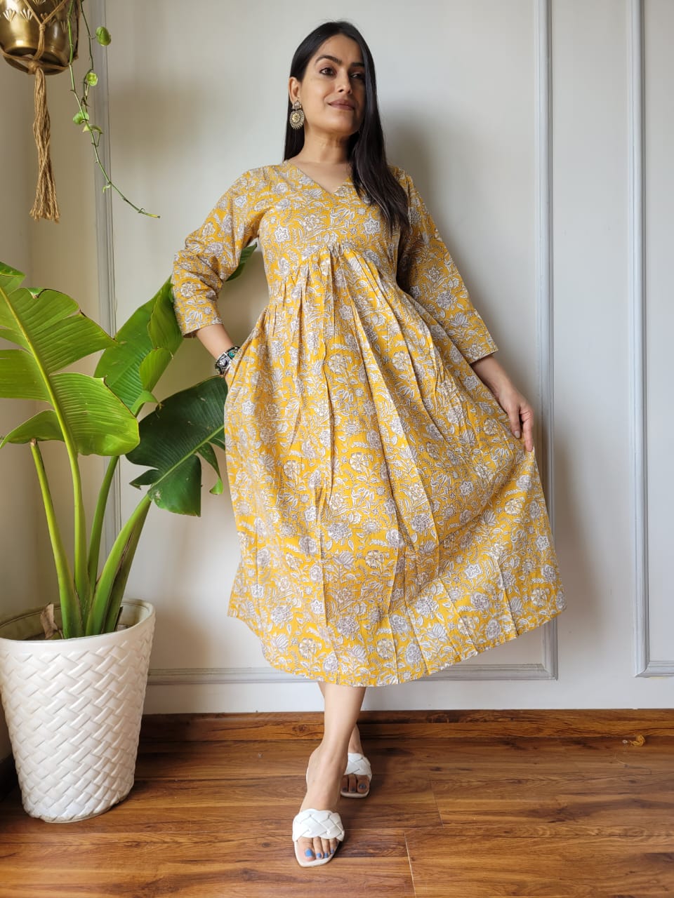 Indulge in the exquisite art of hand block printing with our Mustard Aliya Bagru Hand Block Printed Cotton Dress. Crafted from premium Cotton 60*60 Super Dying fabric, this dress features intricate Bagru block prints that exude traditional charm. The V-neckline, three-quarter sleeves, and pleated waist enhance the flowy silhouette, while the side pockets add functionality. Embrace comfort and style effortlessly with this artisanal creation.