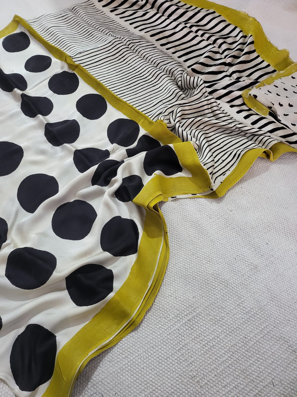 Explore the charm of the Mustard Elegance Polka Dot Modal Silk Saree, where large black polka dots dance alongside thin horizontal stripes on a backdrop of white. The mustard yellow border adds a pop of vibrancy to this artisan-crafted piece. Perfect for those who appreciate attention to detail, this saree exudes a blend of sophistication and playfulness.