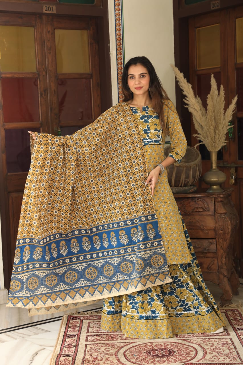 Indulge in the timeless charm of hand block printing with this premium cotton ethnic wear set. Crafted with care, the set features a mustard yellow kurta with a blue floral yoke, complemented by a matching skirt/palazzo and a detailed dupatta. The three-quarter sleeves and intricate floral and geometric patterns add a touch of elegance to this artisanal ensemble, perfect for any occasion.